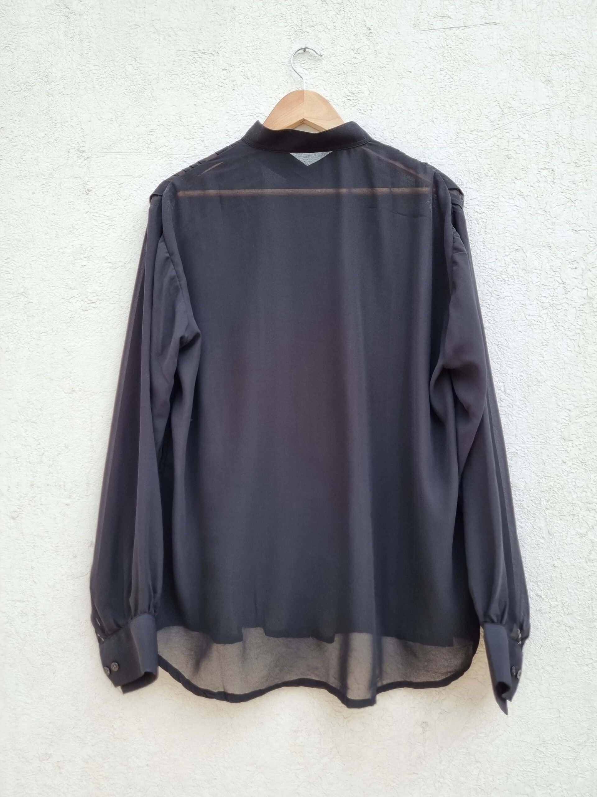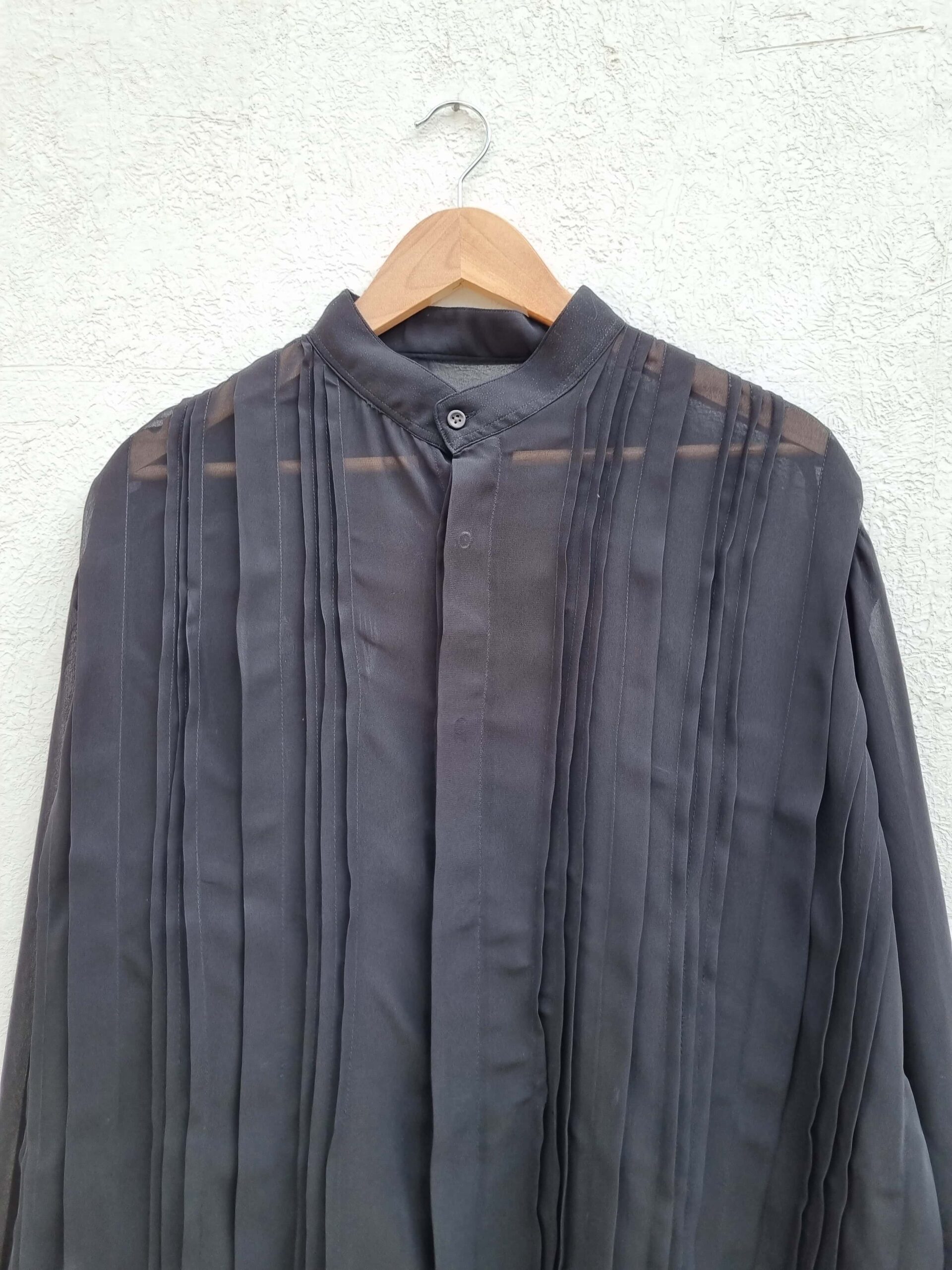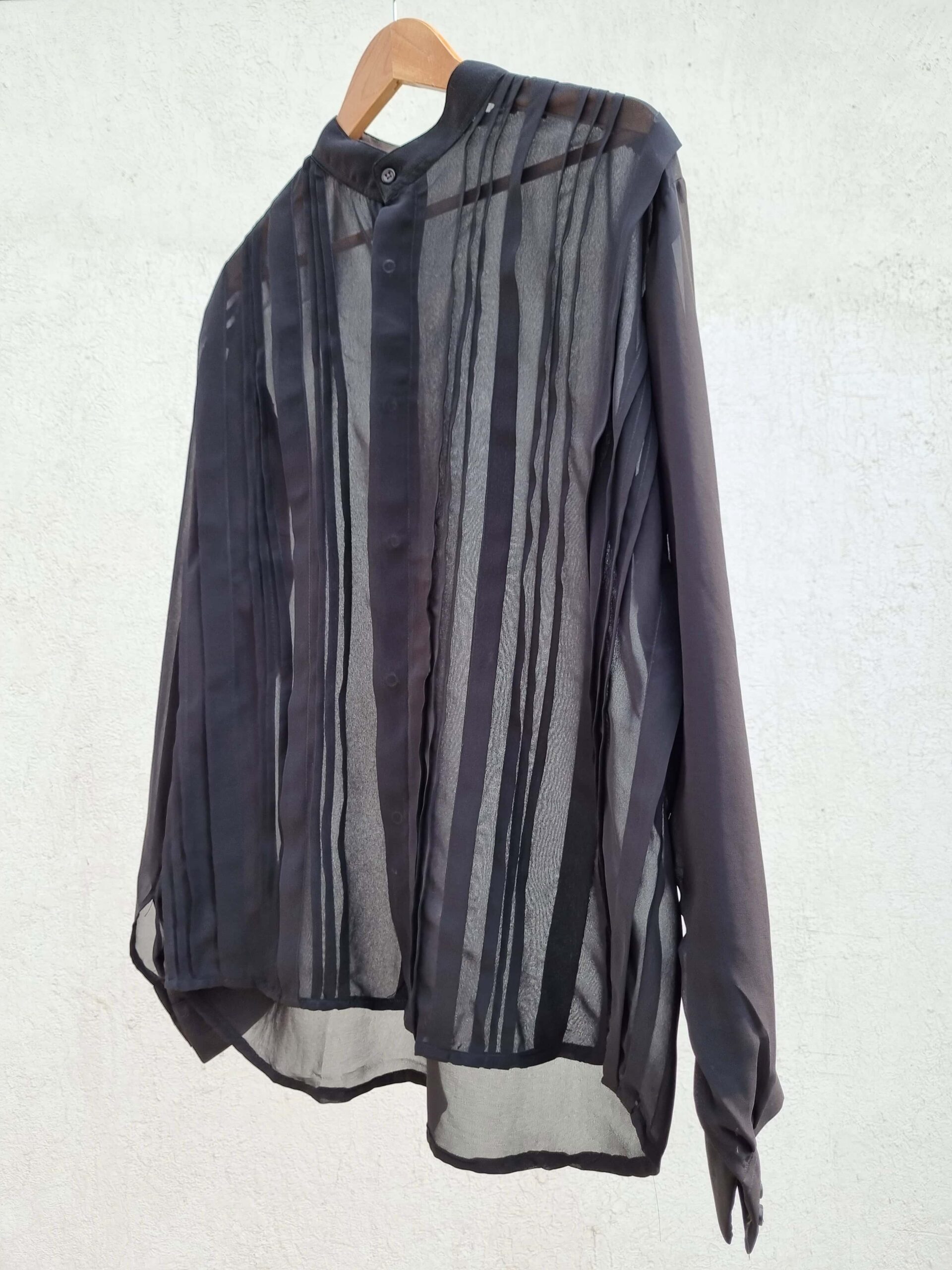 Elevate your everyday style with this black sheer pintuck shirt. This slim-fit top features a lightweight, breathable fabric that drapes comfortably. The subtle pintuck detailing adds a touch of texture and visual interest. Wear it solo for a statement look or layered under a jacket for a versatile piece. This shirt is sure to become a go-to for adding a touch of modern edge to your wardrobe.