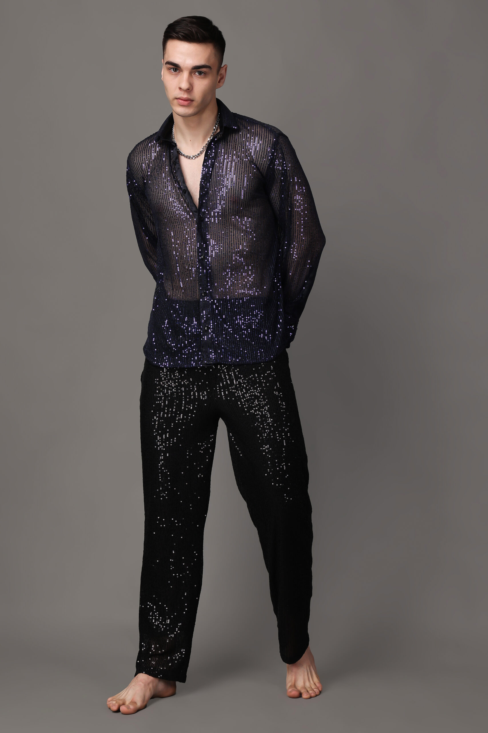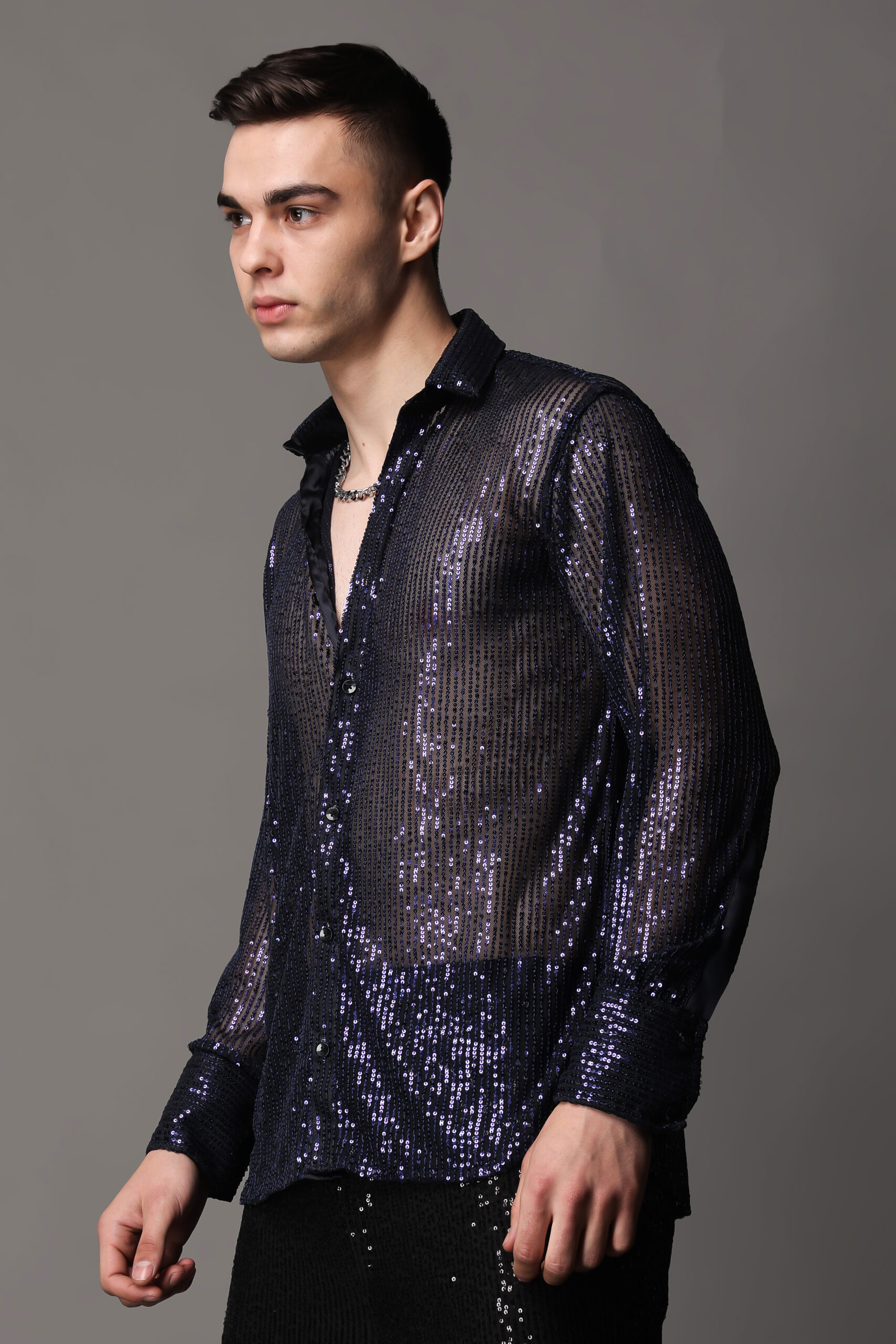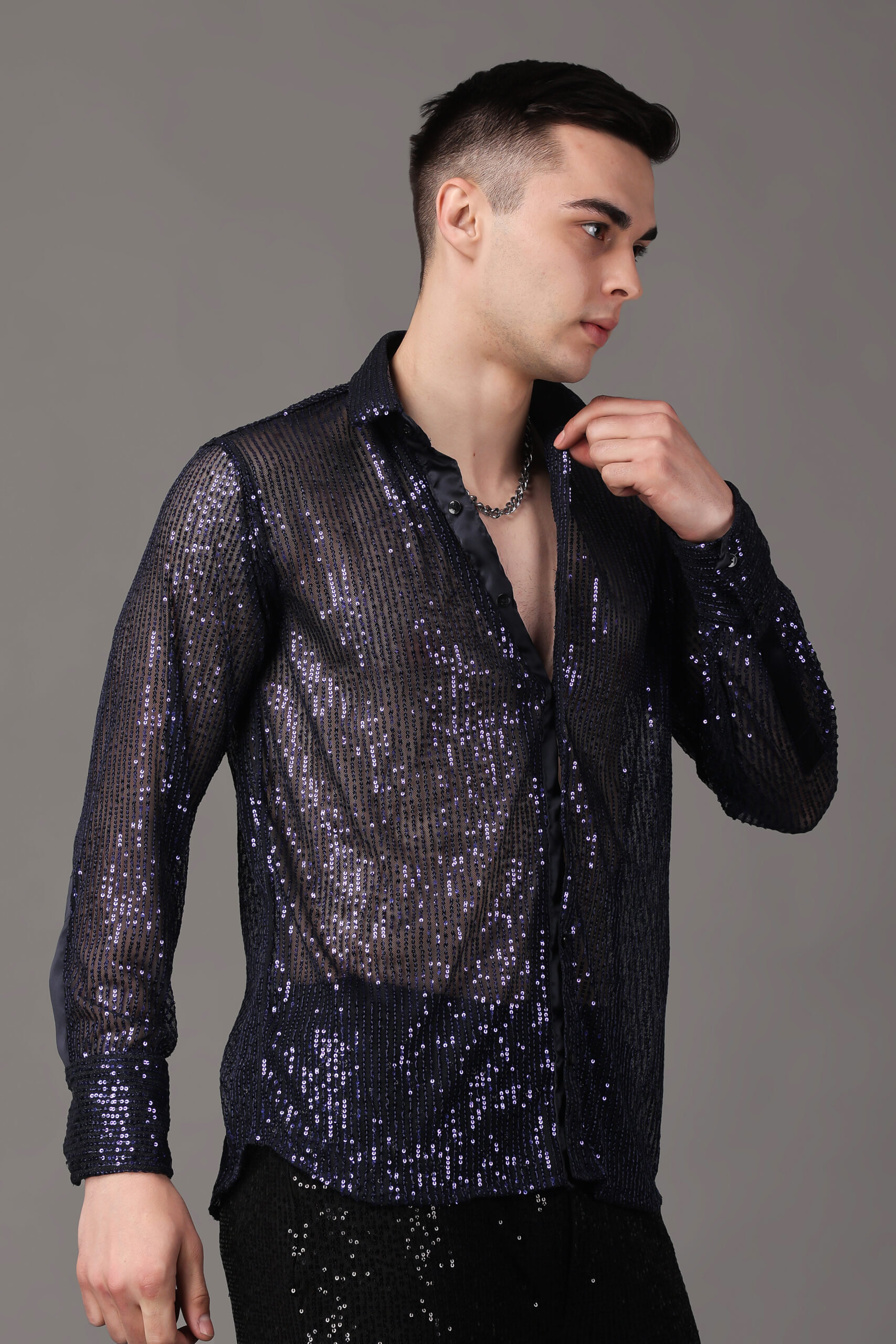 Introducing our Dark Blue Sequin Sheer Shirt, an exquisite blend of allure and sophistication. This shirt combines the richness of a deep blue hue with the glamour of carefully arranged sequins, creating a captivating and elegant ensemble. The sheer fabric adds a touch of sensuality, allowing you to play with layers and create versatile looks. Whether you’re attending a special event or aiming for a chic evening out, the Dark Blue Sequin Sheer Shirt promises to make a bold statement. Elevate your style with this enchanting piece, where the opulence of sequins meets the delicate transparency of sheer fabric for a look that’s both daring and refined.