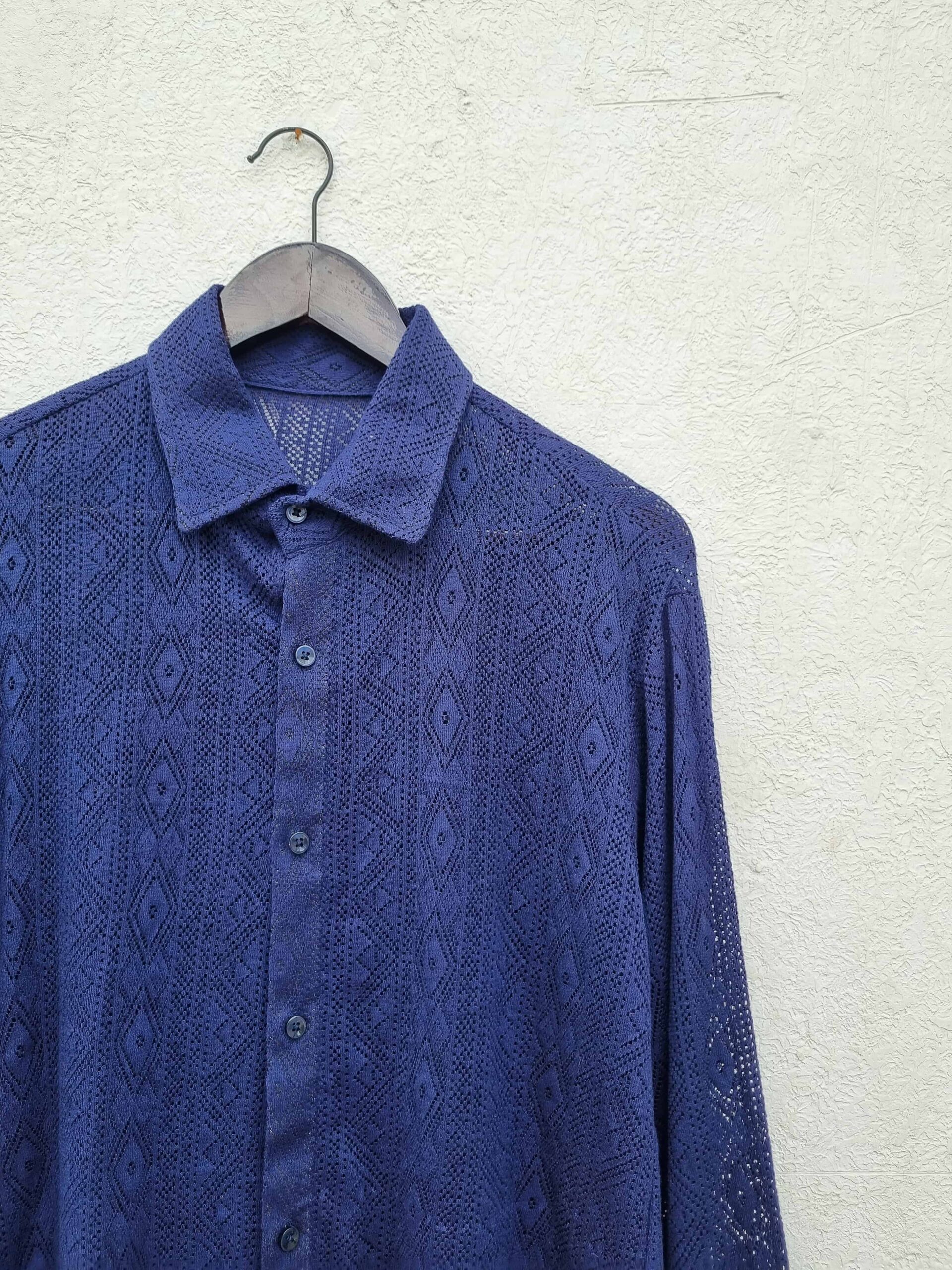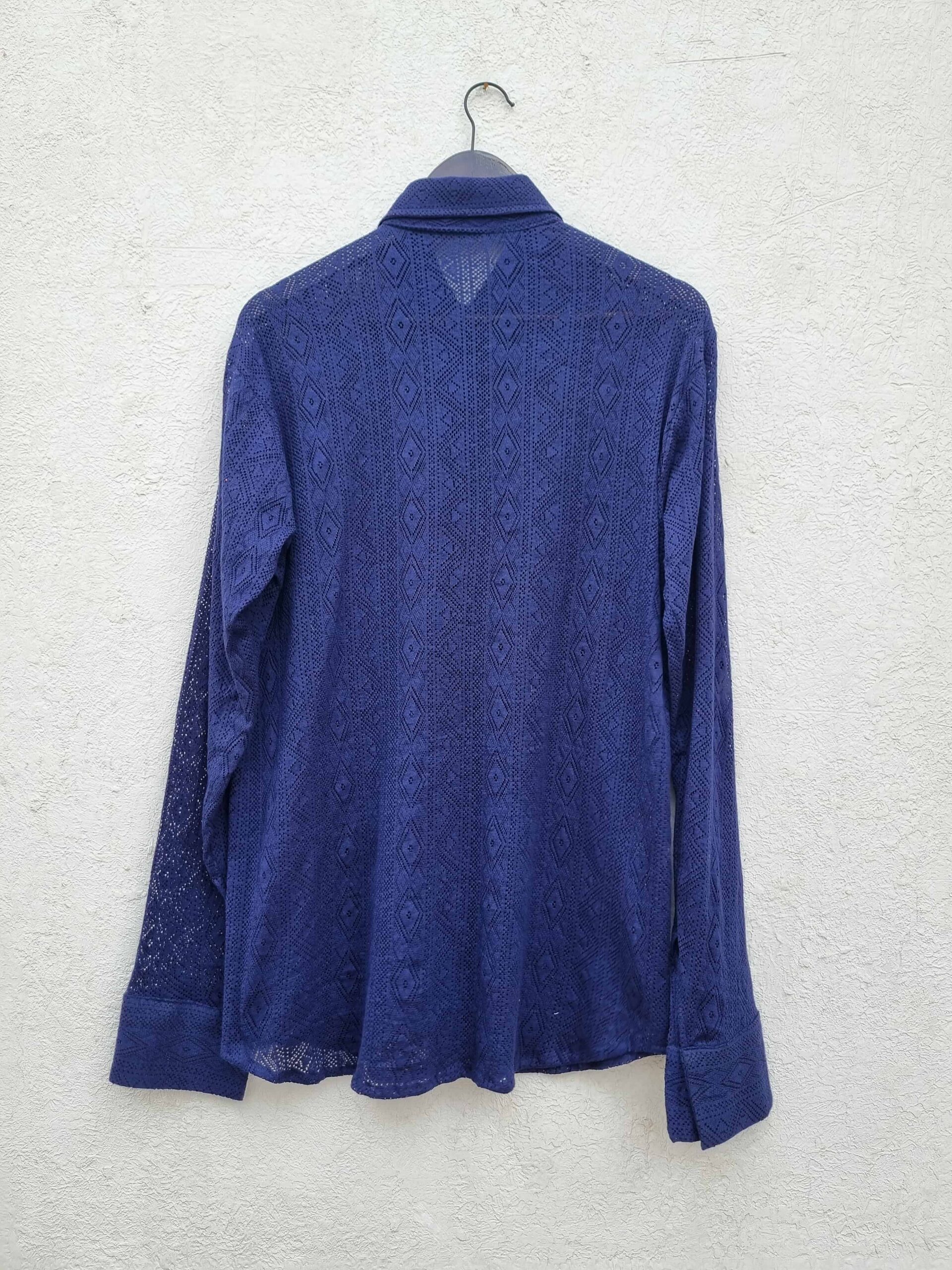 Elevate your wardrobe with this exquisite blue full sleeve crochet shirt. Crafted with meticulous attention to detail, this versatile piece features intricate tribals and delicate, airy fabric, offering both style and comfort. Perfect for layering under a jacket or wearing solo for a breezy, bohemian vibe, it’s ideal for any season. The regular fit and timeless design make it a staple for casual outings or dressed-up occasions. Pair it with jeans for a chic daytime look or a trouser for an elegant evening ensemble. Add this elegant blue full sleeve crochet shirt to your collection and enjoy its blend of sophistication and ease.