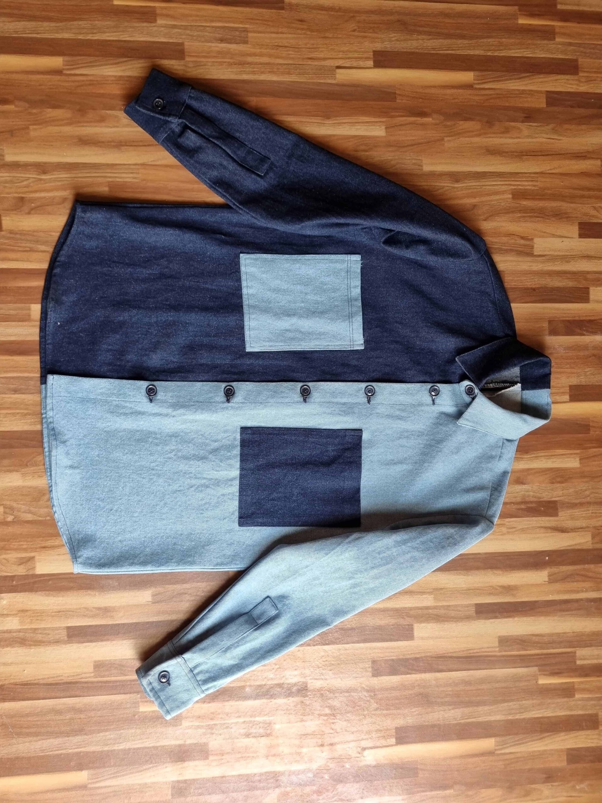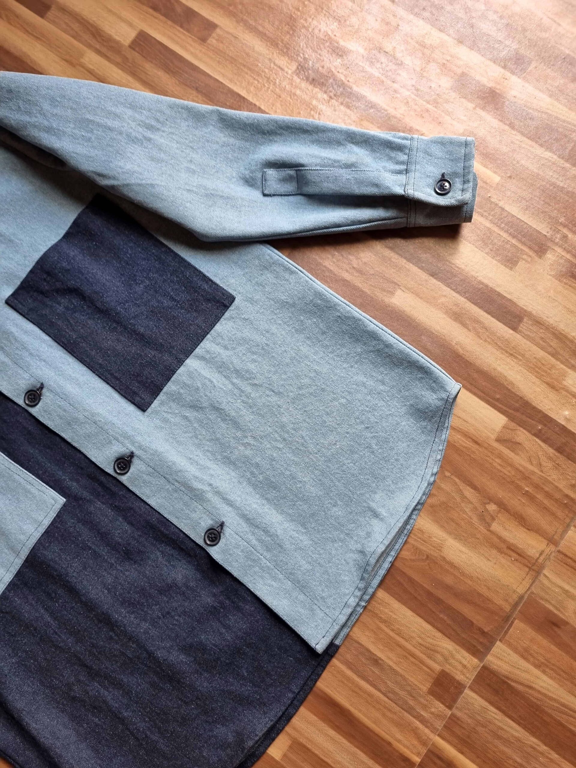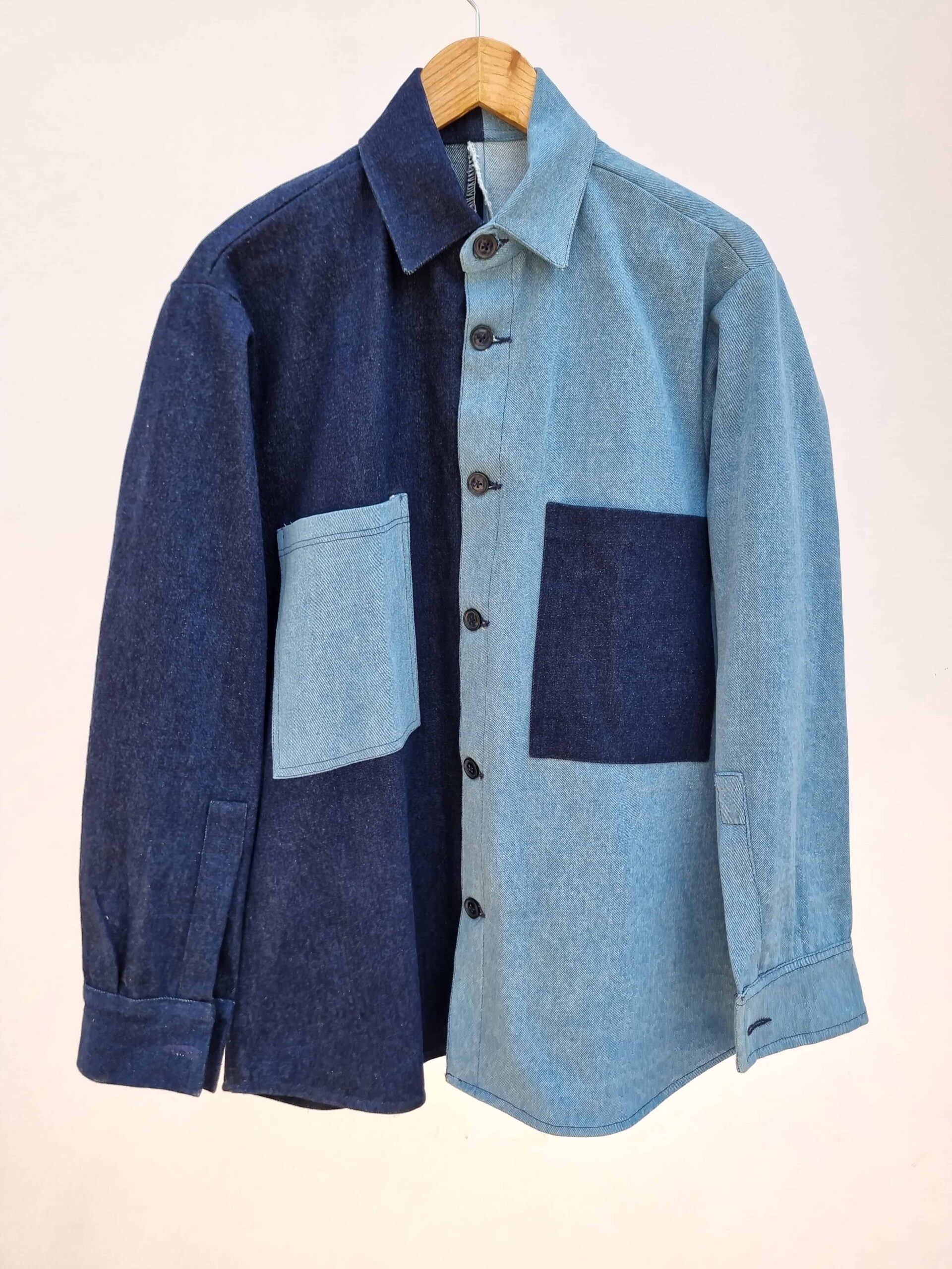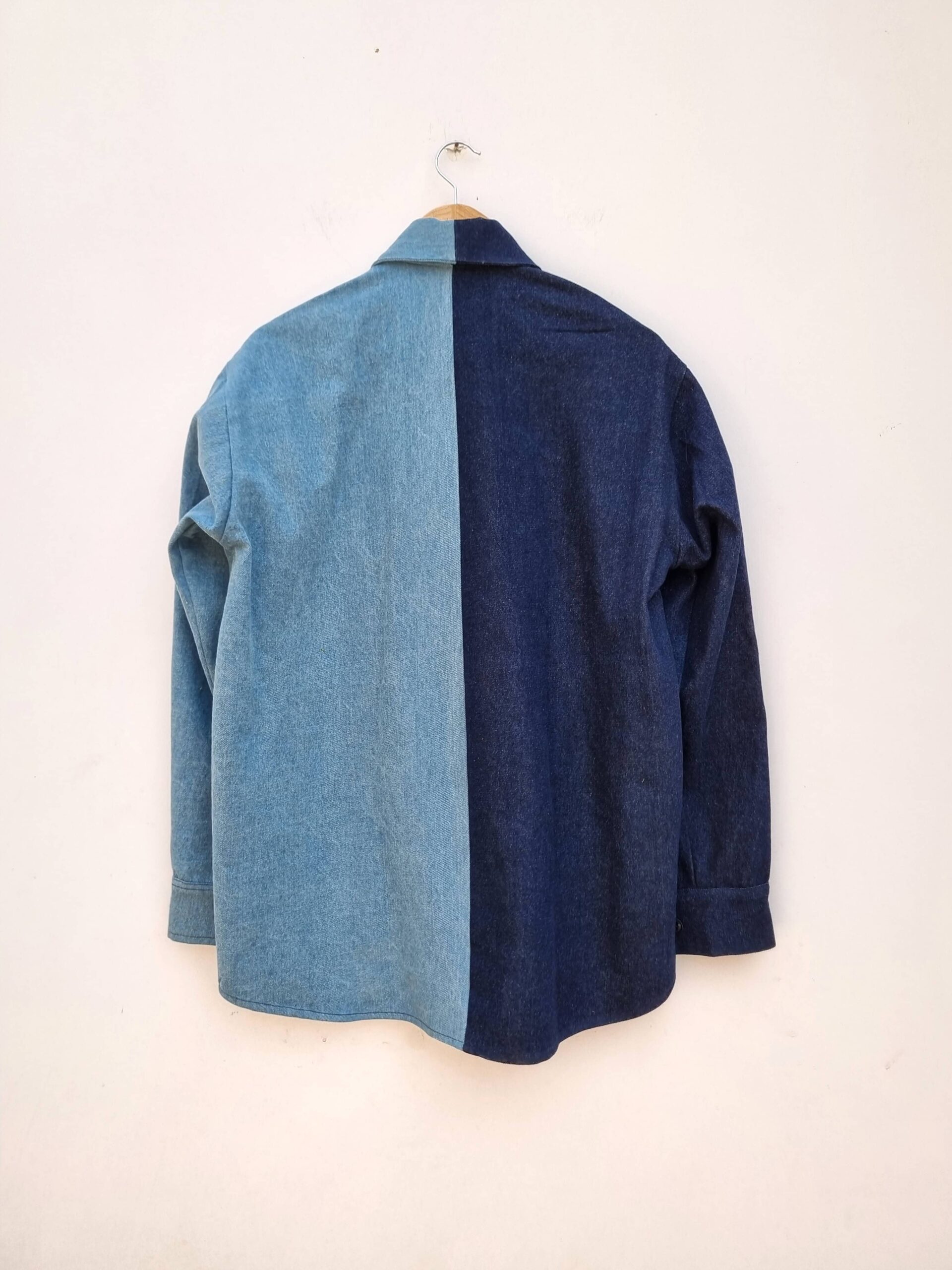 Elevate your denim game with this modern color block shirt. Featuring a contrasting light blue denim at one side deep blue other side, this relaxed-fit shirt offers a comfortable look. Crafted from comfortable denim, it drapes effortlessly and flatters your figure. Pair it with dark wash jeans for a head-to-toe denim look, or throw it on over a white tee for a casual yet put-together vibe.
