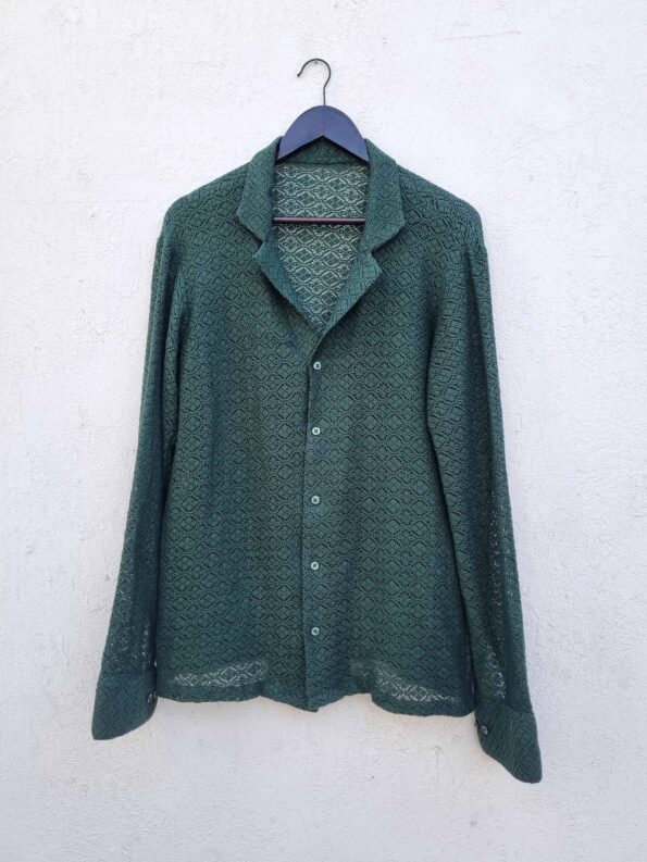 Elevate your wardrobe with this exquisite green full sleeve crochet shirt. Crafted with meticulous attention to detail, this versatile piece features intricate florals and delicate, airy fabric, offering both style and comfort. Perfect for layering under a jacket or wearing solo for a breezy, bohemian vibe, it’s ideal for any season. The regular fit and timeless design make it a staple for casual outings or dressed-up occasions. Pair it with jeans for a chic daytime look or a trouser for an elegant evening ensemble. Add this elegant green full sleeve crochet shirt to your collection and enjoy its blend of sophistication and ease.