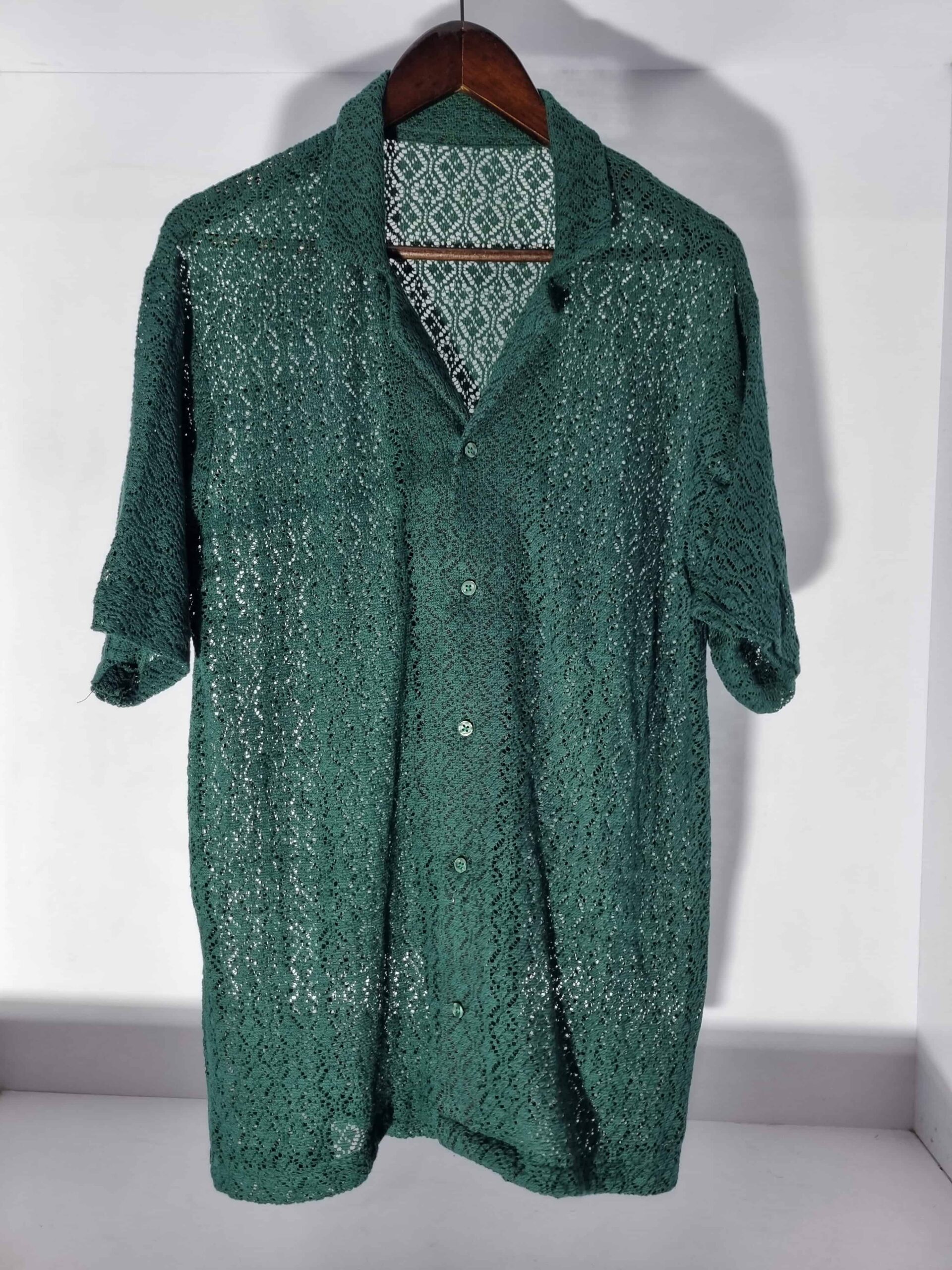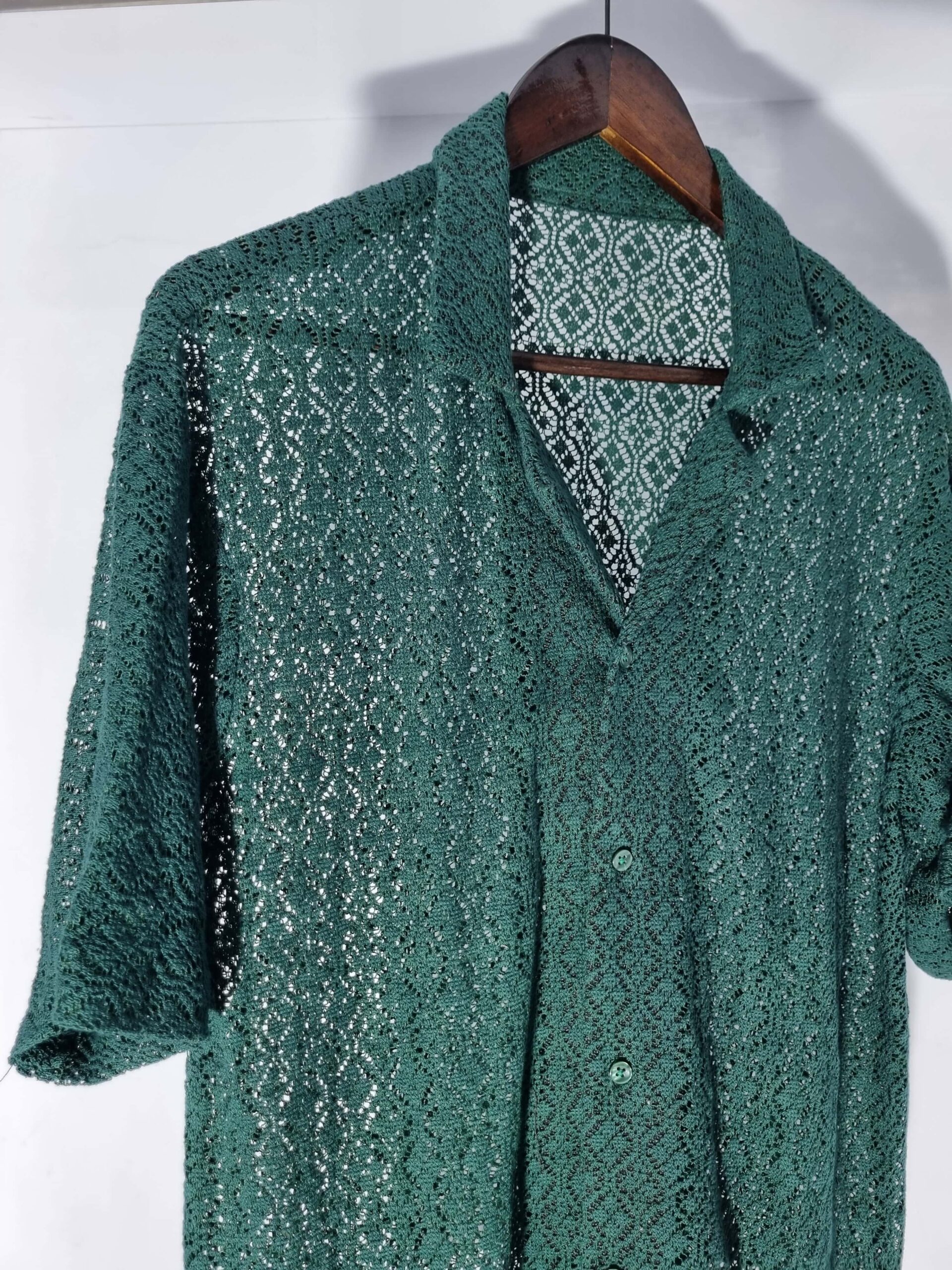 Elevate your wardrobe with this exquisite forest green crochet shirt. Crafted with meticulous attention to detail, this versatile piece features intricate floral and delicate, airy fabric, offering both style and comfort. Perfect for layering under a jacket or wearing solo for a breezy, bohemian vibe, it’s ideal for any season. The regular fit and timeless design make it a staple for casual outings or dressed-up occasions. Pair it with jeans for a chic daytime look or a trouser for an elegant evening ensemble. Add this elegant forest green crochet shirt to your collection and enjoy its blend of sophistication and ease.