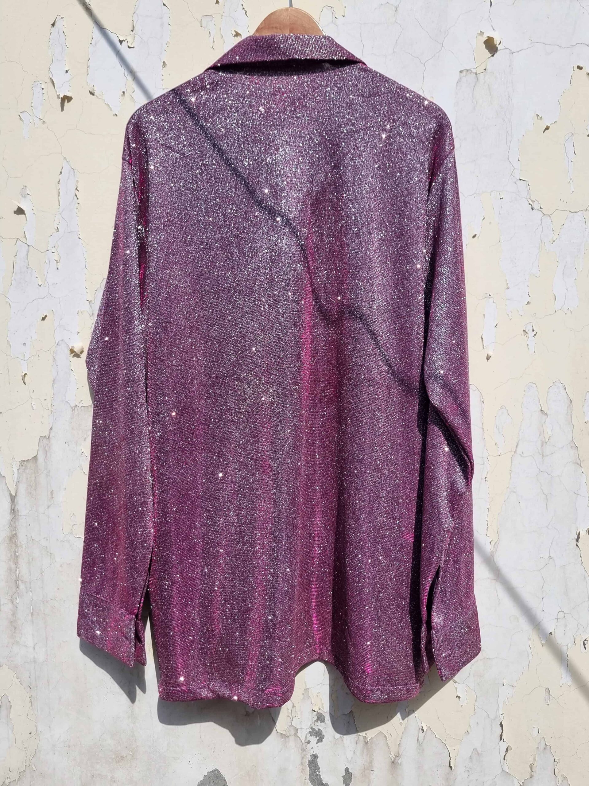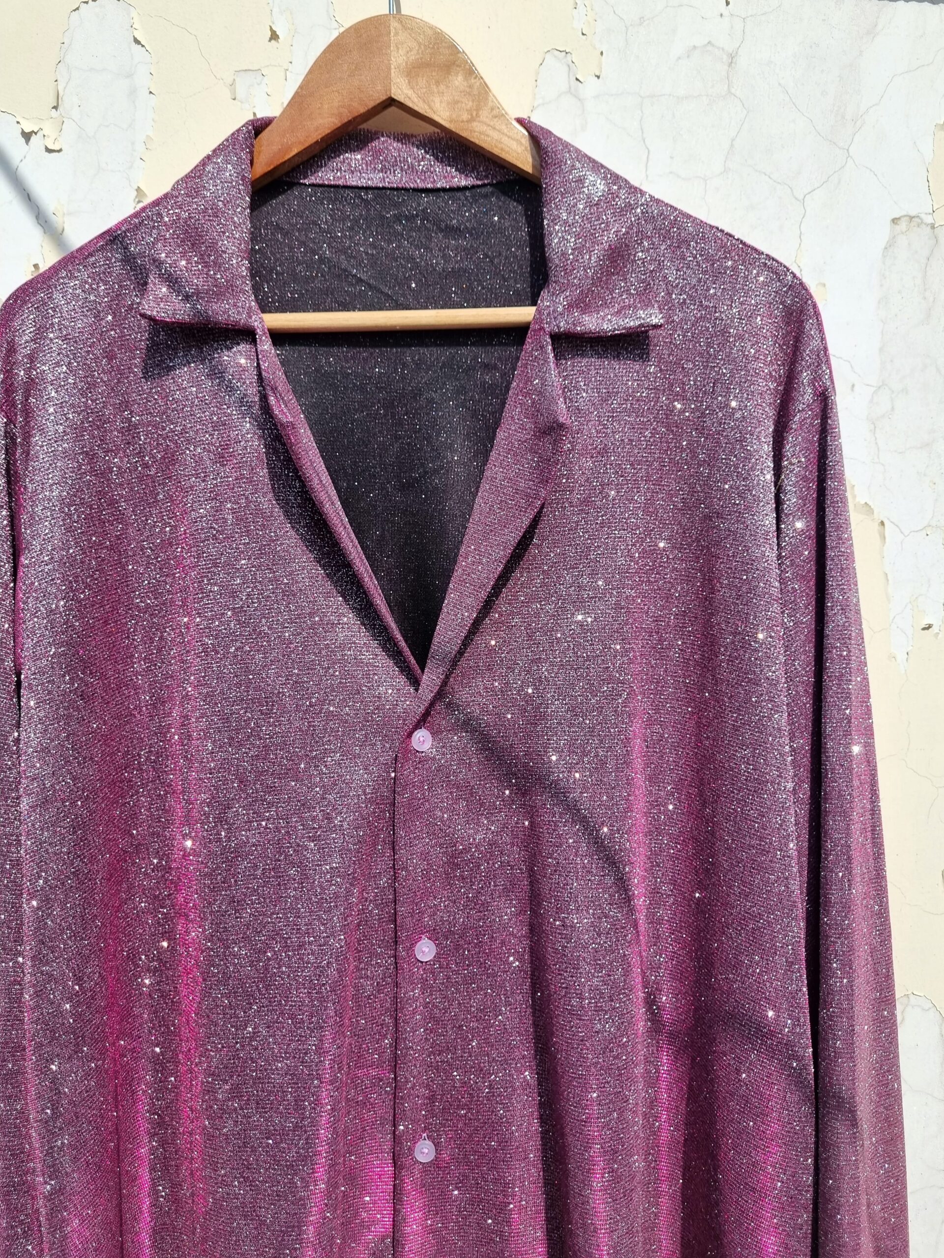 Unleash your inner rock royalty with this outrageous fuchsia glitter shirt! This shirt isn’t for the faint of heart – it’s a full-on explosion of shimmering fuchsia glitter that will guarantee you’re the center of attention. Forget subtlety, this statement piece is crafted entirely from dazzling sequins, creating a show-stopping look that demands a stage. The full sleeves add a touch of drama, while the sharp notch collar delivers a sophisticated edge. Shine brighter than ever under the spotlight and command the room with this unforgettable glitter shirt.