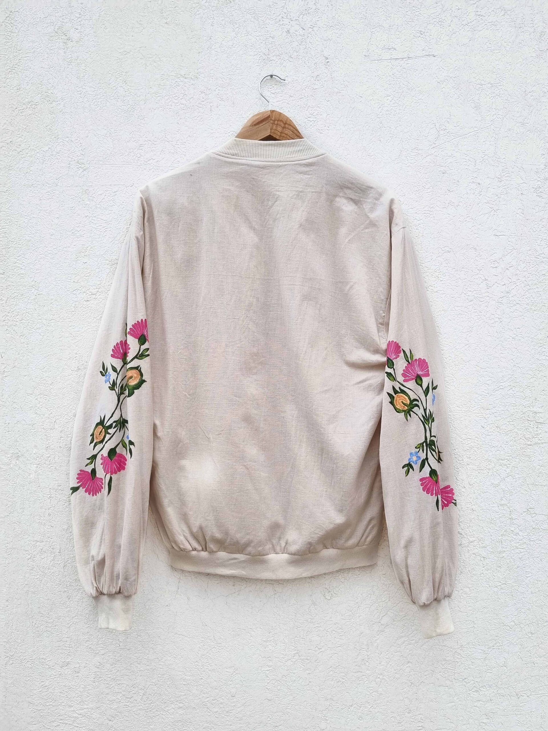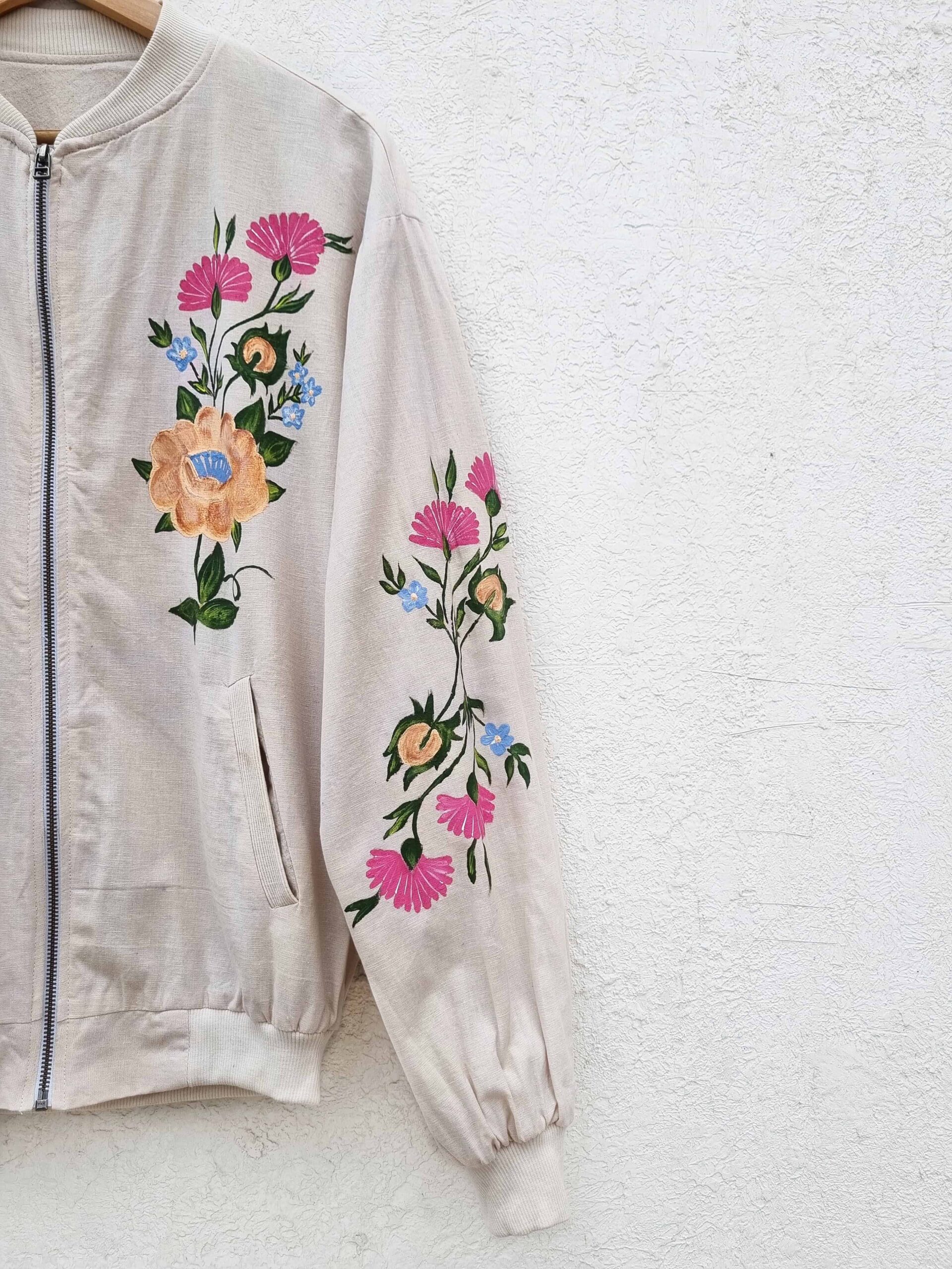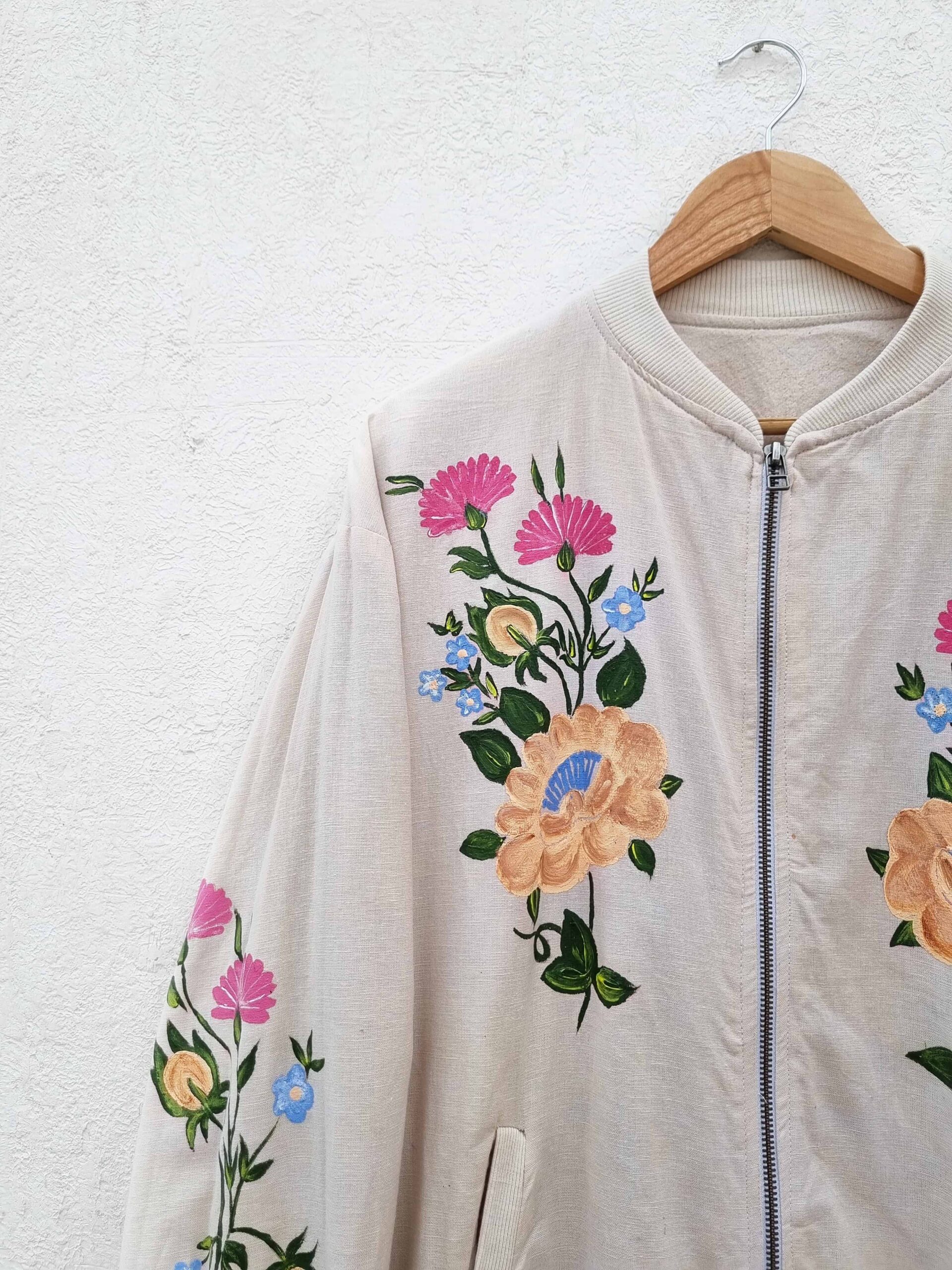 Introducing our Off-White Hand-Painted Floral Bomber Jacket, a unique blend of artistry and style. Crafted from premium cotton slub fabric, this jacket offers both comfort and a distinctive texture. The off-white background beautifully showcases the intricate hand-painted floral designs, making each jacket a one-of-a-kind piece. Classic bomber features such as ribbed cuffs, a zippered front, and a tailored fit ensure versatility and ease of wear. Perfect for adding a touch of elegance to any casual outfit, this hand-painted floral bomber jacket is a standout addition to your wardrobe. Embrace the fusion of contemporary fashion and artisanal craftsmanship with this exquisite jacket.