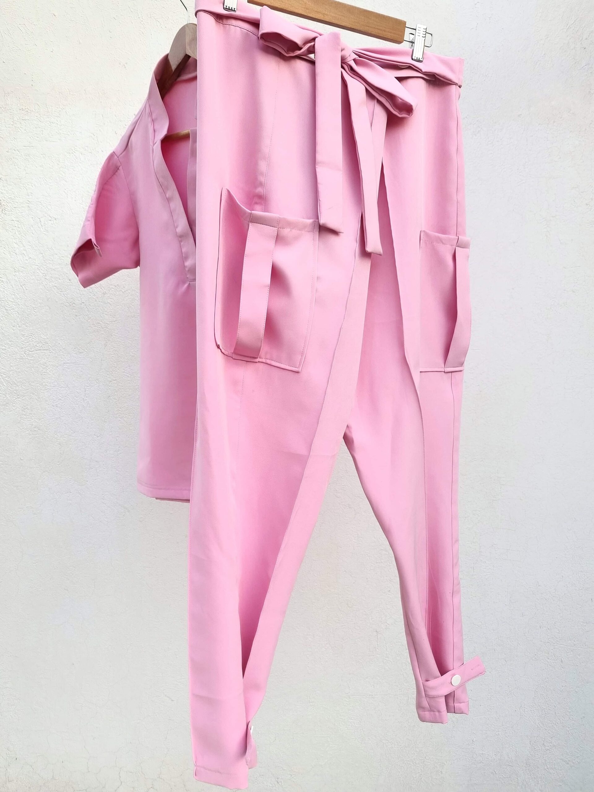 Introducing our trendy Pink New Style Co-ord Set, a perfect blend of fashion-forward design and functionality. This stylish ensemble features a unique cargo pant with a folded waist, providing a modern and edgy look. The cargo pants are equipped with practical tie-up and button straps at the ankles, allowing for adjustable comfort and a personalized fit. Paired with a standout star-neck T-shirt, this co-ord set combines a playful touch with contemporary style. The vibrant pink hue adds a pop of color to your wardrobe, making it ideal for casual outings and street-style statements. Elevate your fashion game with this chic and versatile Pink New Style Co-ord Set.