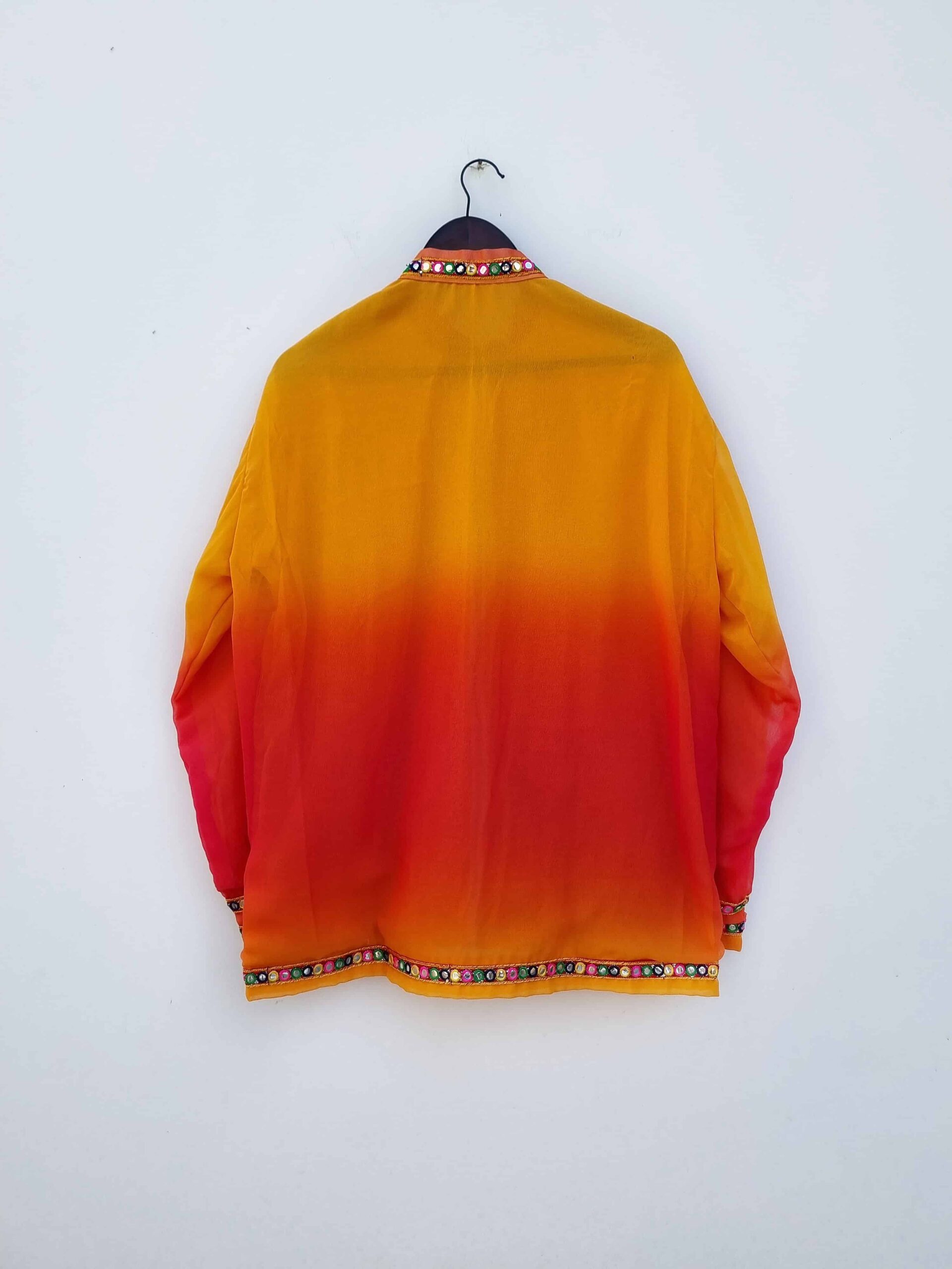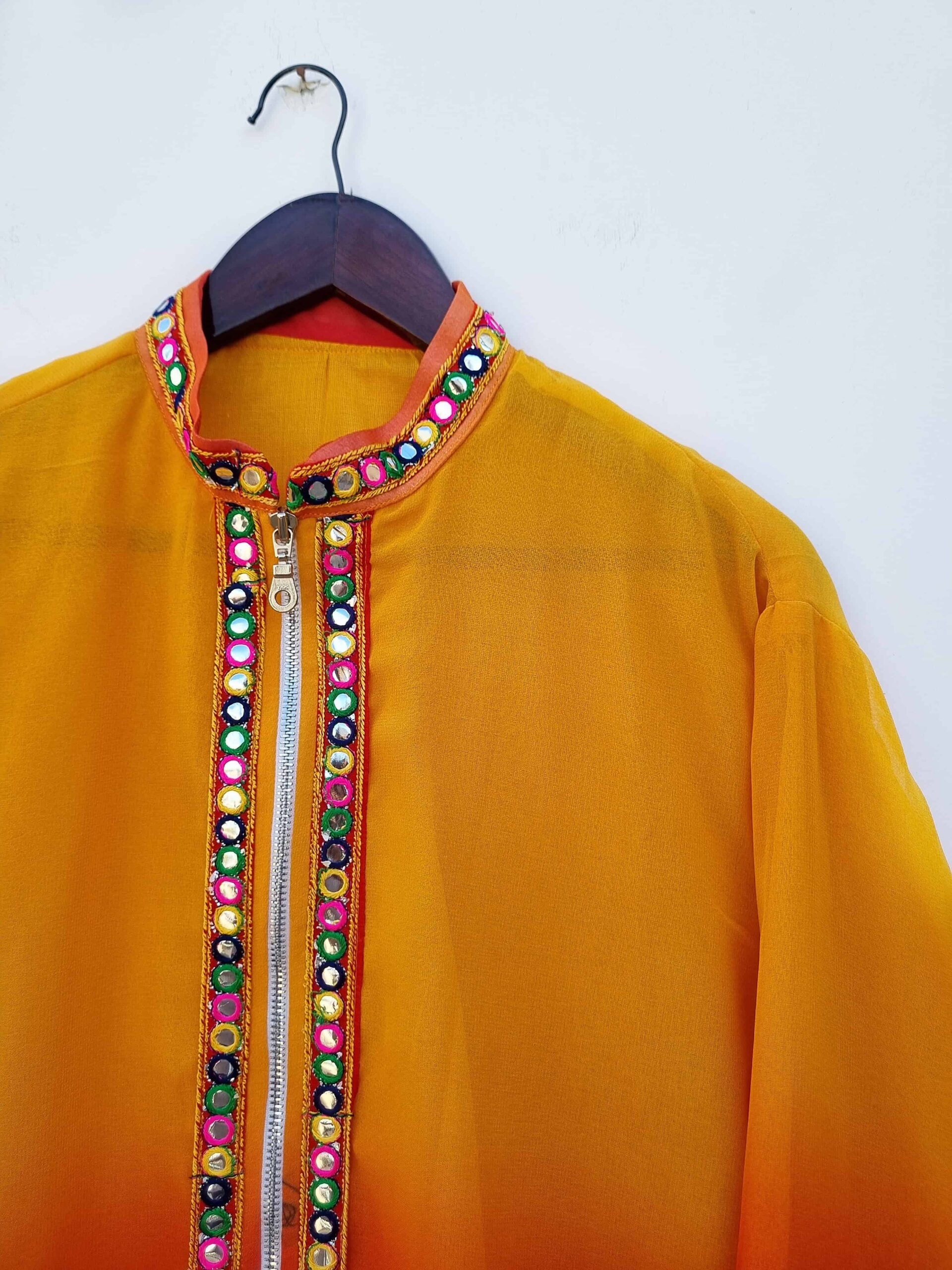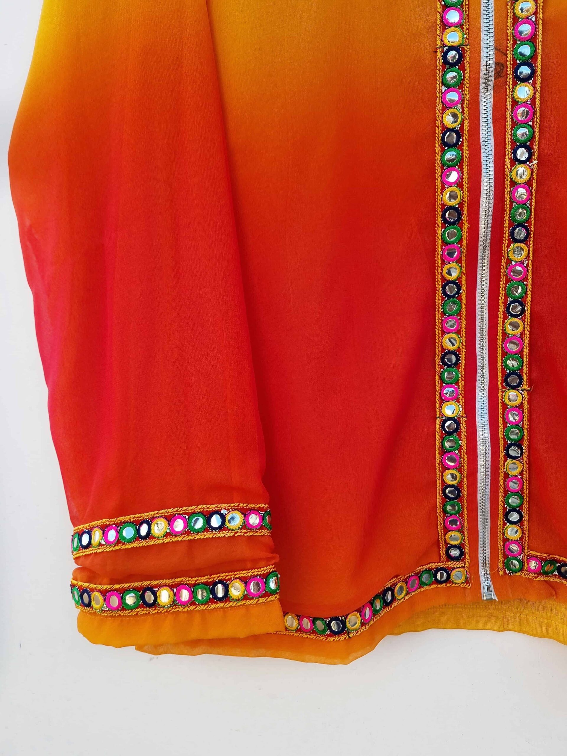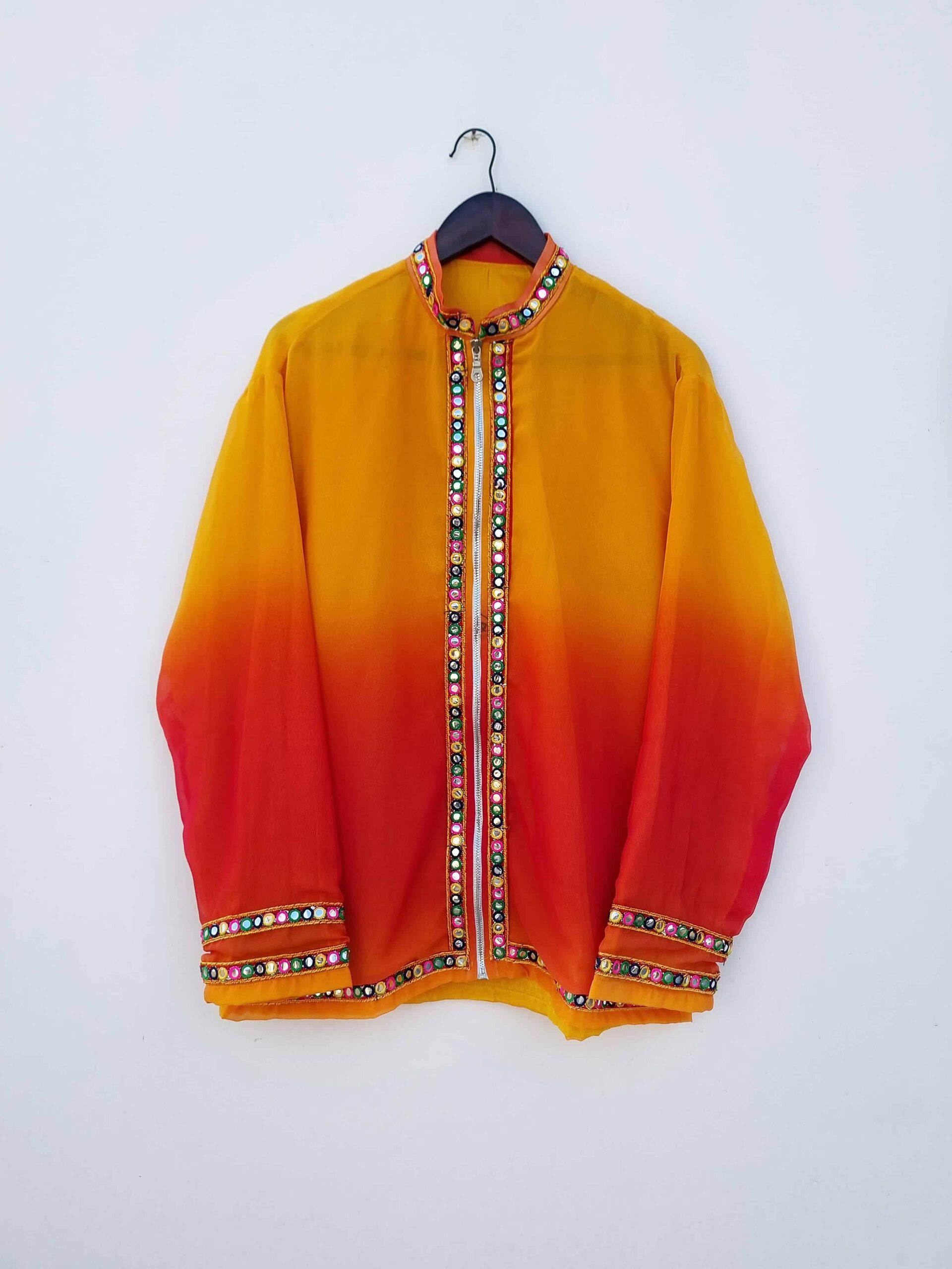 Embrace a vibrant ethnic look with this stunning yellow to red ombre mirror-laced zip-up jacket. The beautiful ombre gradient transitions from bright yellow to rich red, creating a striking visual appeal. Adorned with intricate mirror lace detailing, this jacket captures the essence of traditional craftsmanship while adding a modern twist. The zip-up front provides practicality and versatility, making it easy to layer over various outfits. Made from high-quality, breathable fabric, it ensures comfort and durability. Perfect for festive occasions or adding a pop of color to your everyday wear, this jacket is a standout piece that effortlessly blends ethnic elegance with contemporary style.