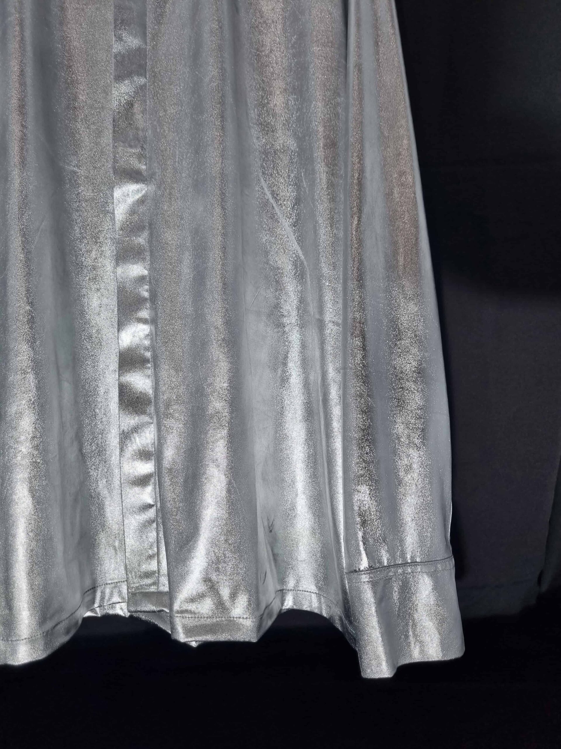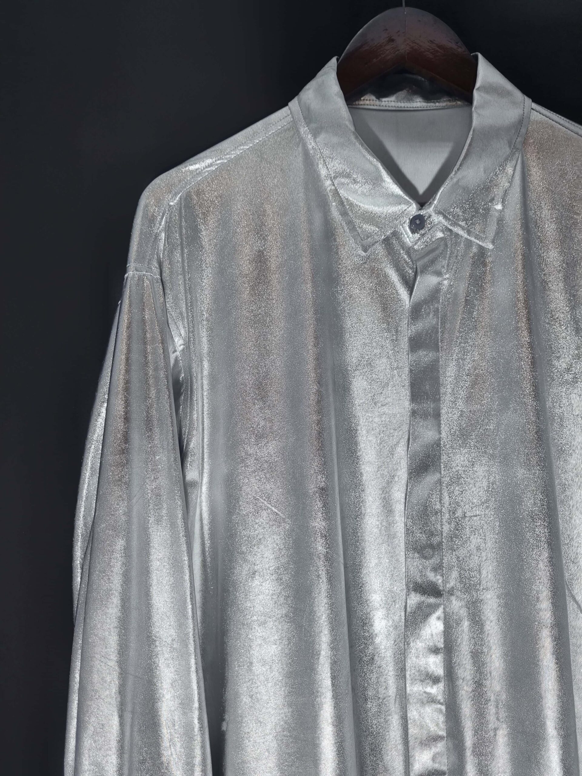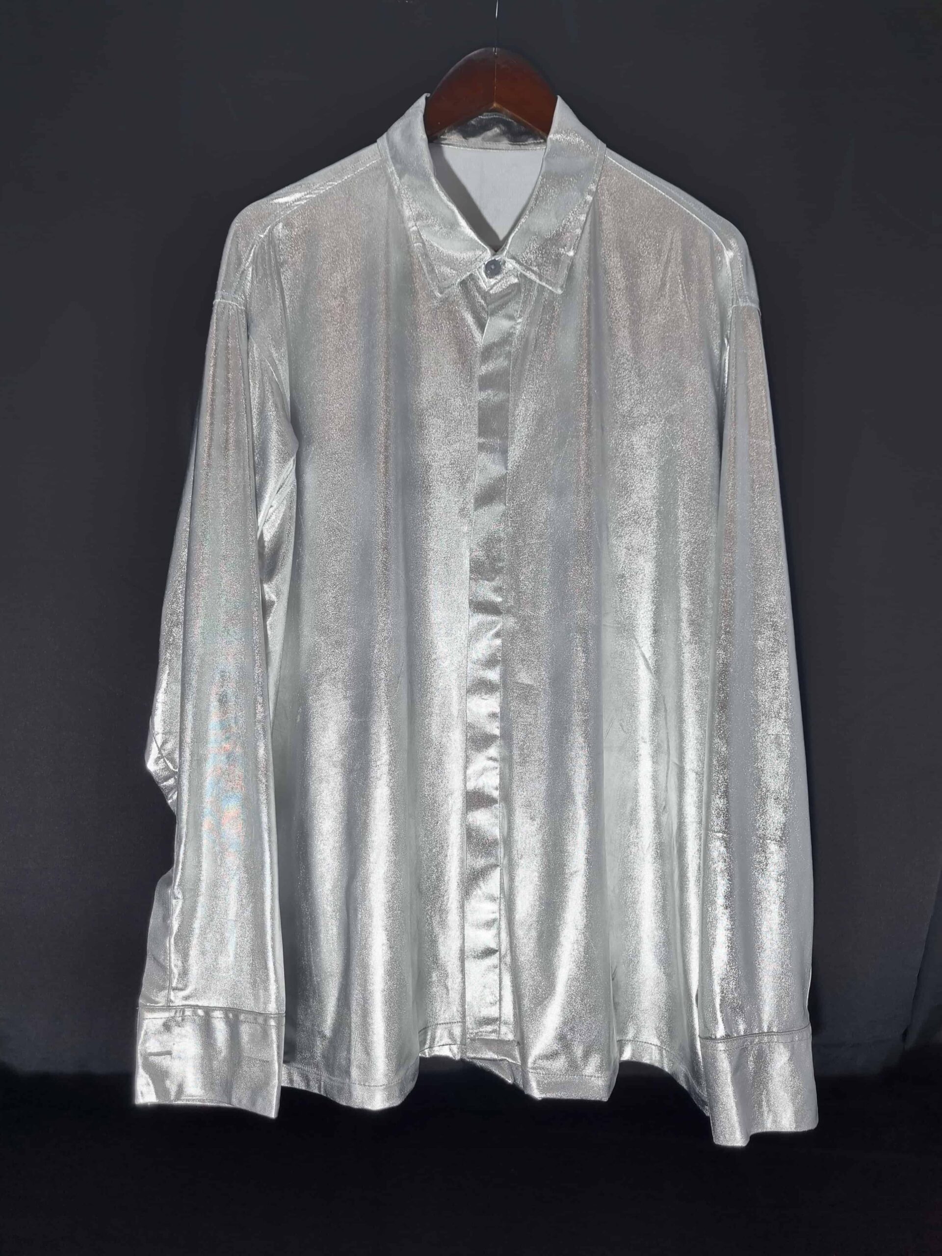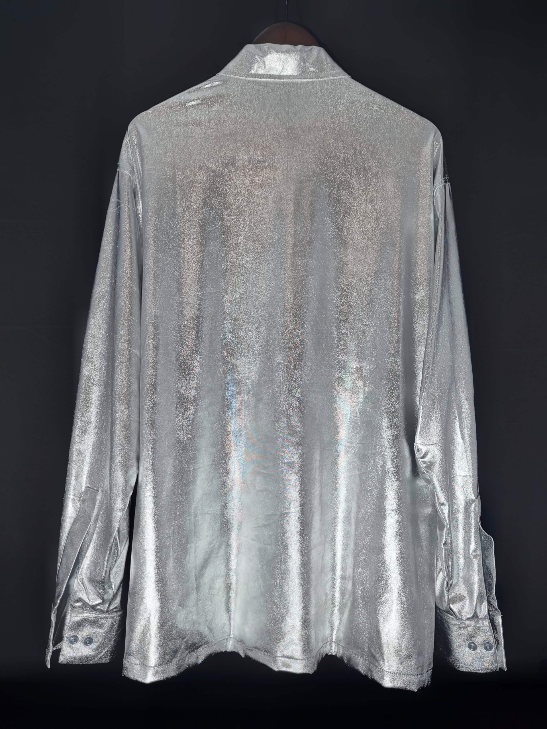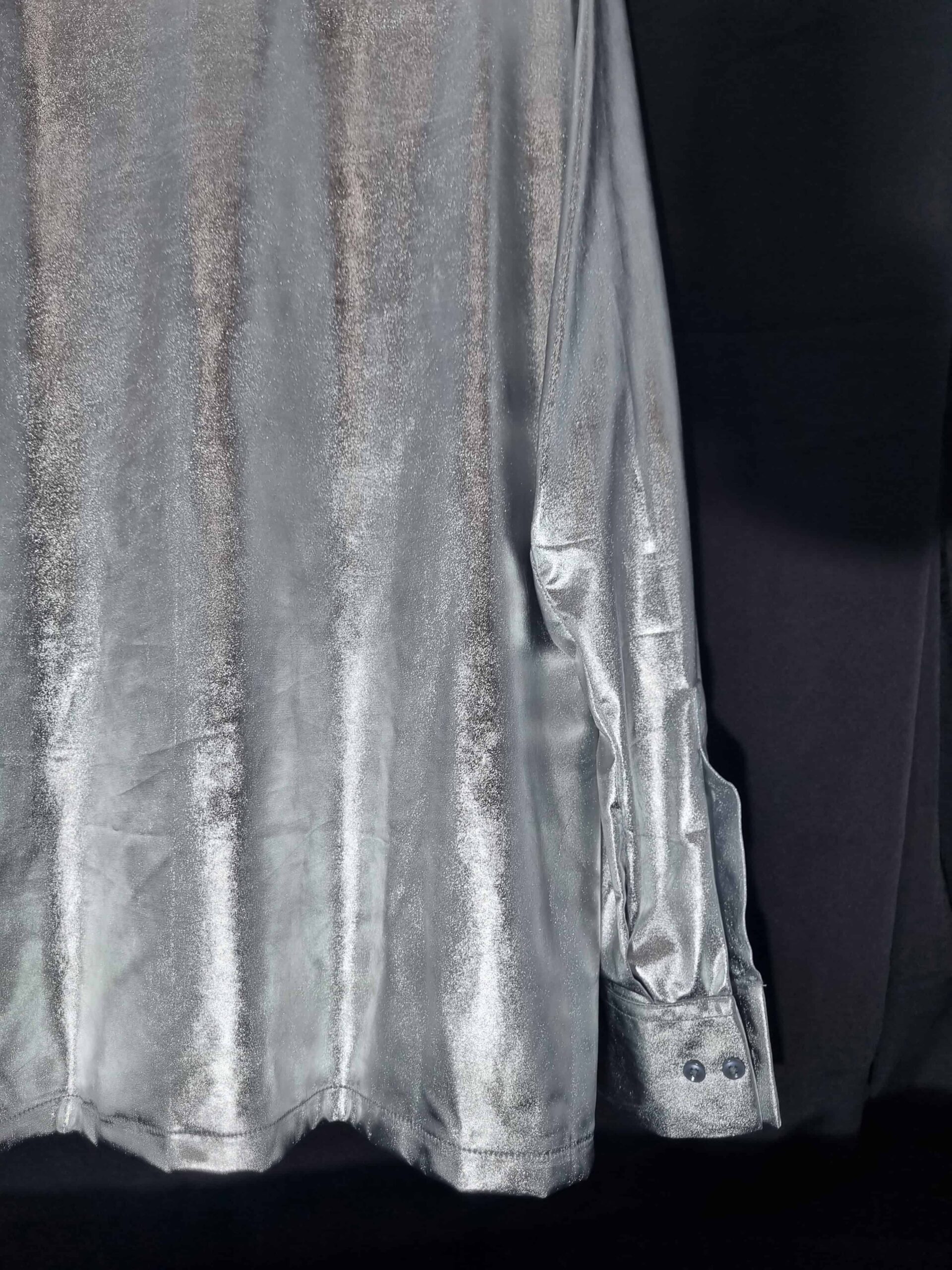 Unleash your inner rockstar with this dazzling silver metallic shirt! Crafted entirely from shimmering silver fabric, this shirt isn’t just a top, it’s a conversation starter. Imagine catching the light and radiating pure metallic shine. Made from a comfortable lycra base for breathability, you can party hard and look fabulous all night long. This statement piece is perfect for a night out, a concert, or adding some serious shine to your everyday. Channel your inner glam and turn any night into a celebration with this unforgettable silver metallic shirt!