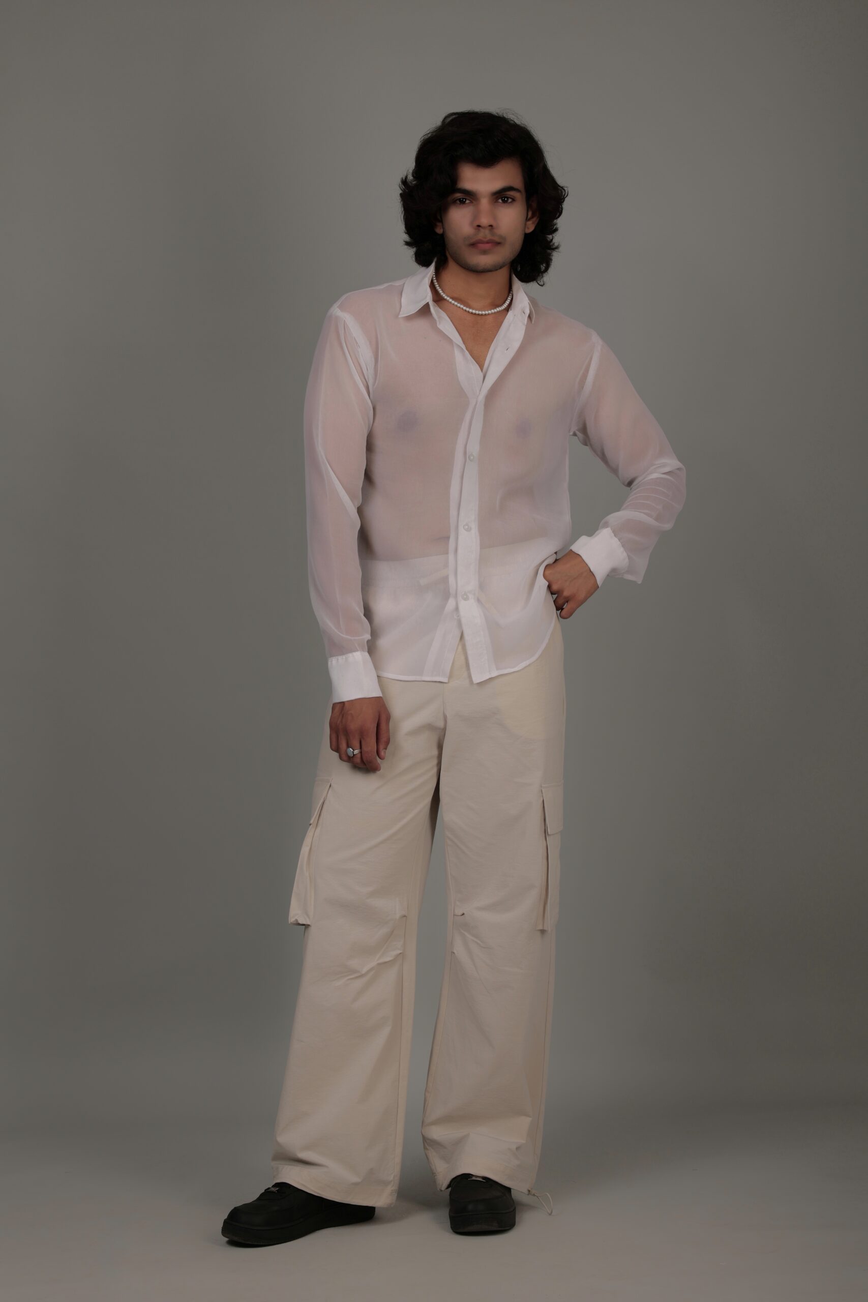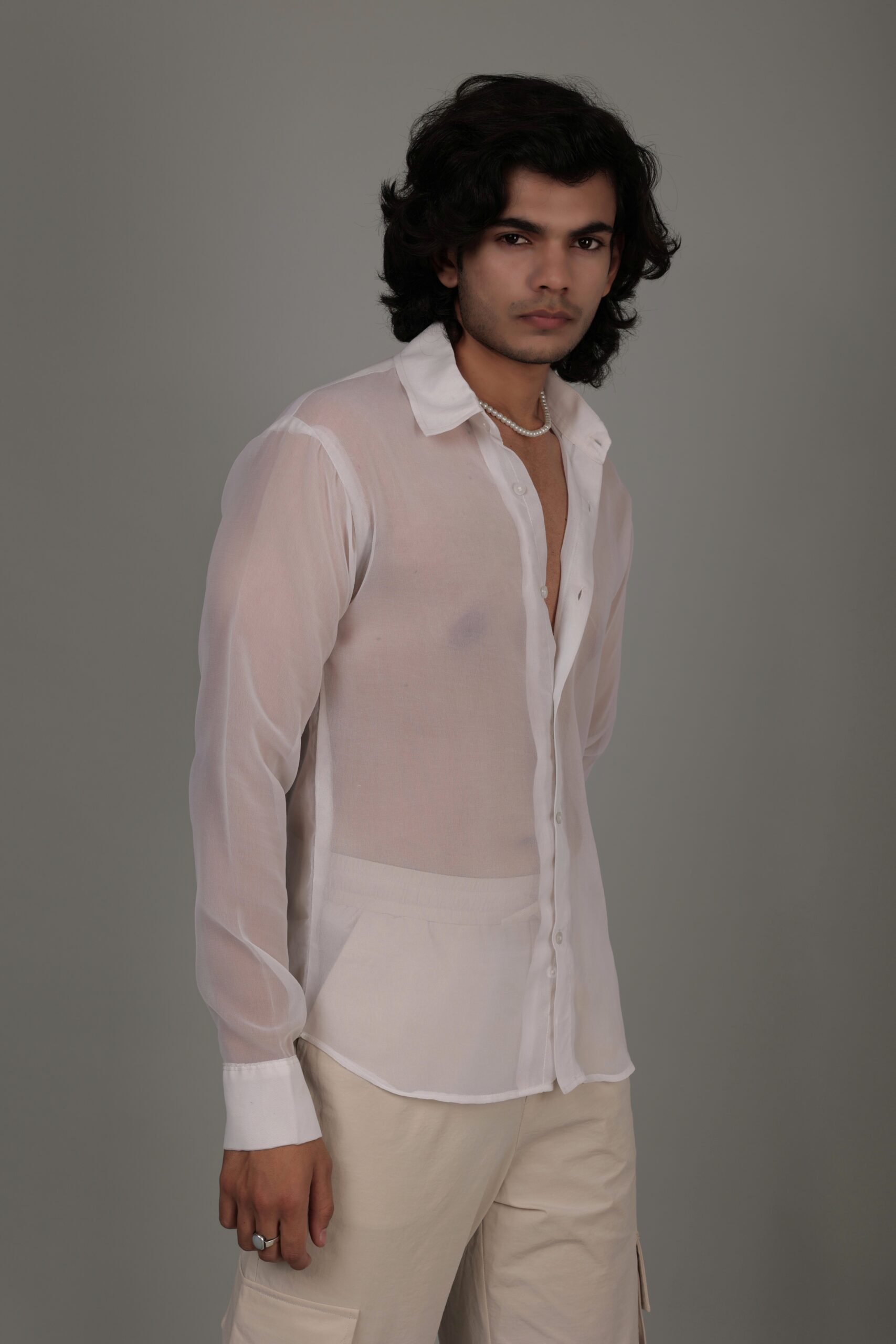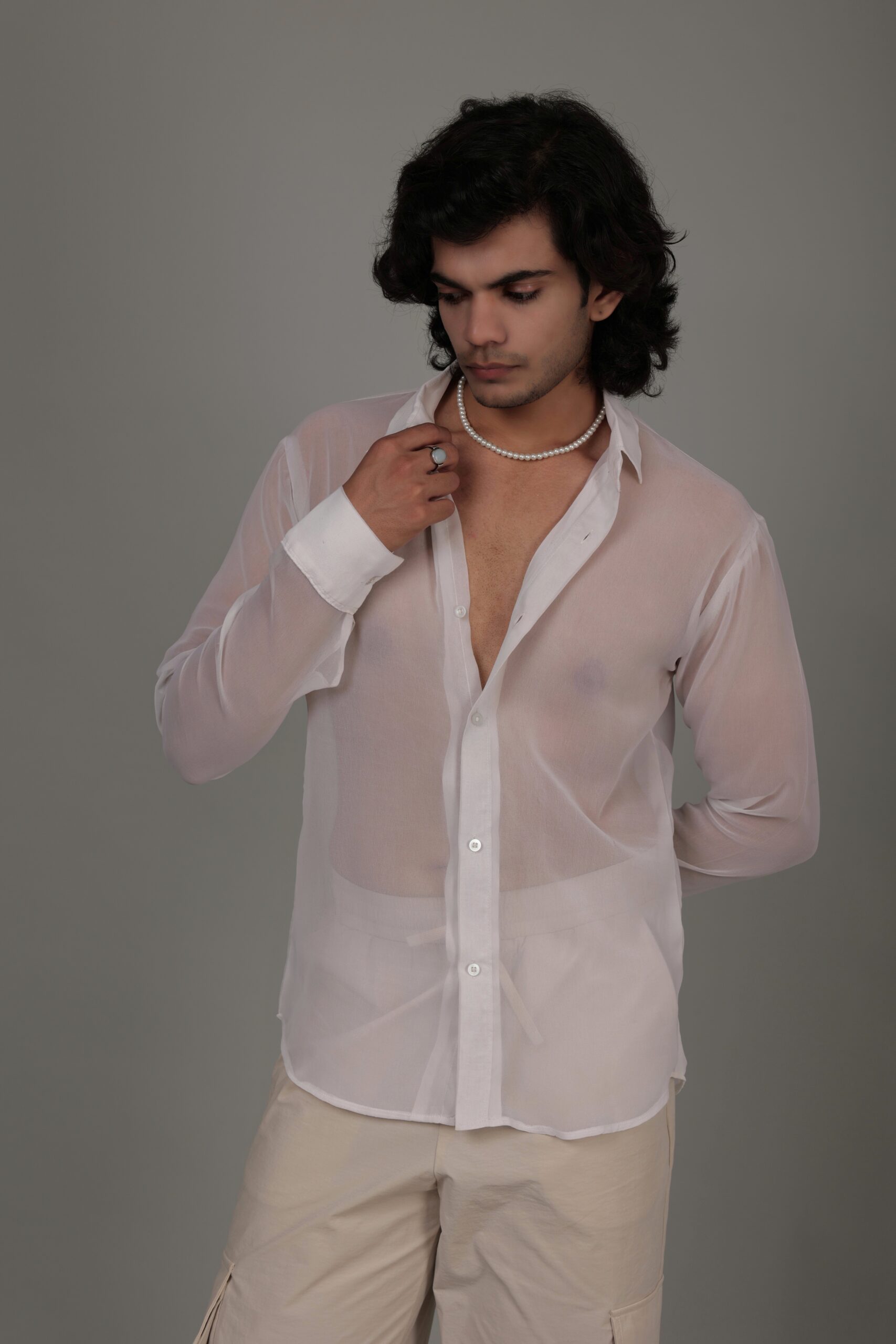Introducing our White Sheer Shirt, a timeless and versatile piece that effortlessly combines sophistication with allure. Crafted from delicate sheer fabric, this shirt exudes an understated elegance, allowing you to make a subtle yet impactful statement. The sheer quality adds a touch of sensuality, making it perfect for both casual and formal occasions. The classic white hue enhances its versatility, creating a wardrobe staple that pairs seamlessly with various ensembles. The tailored fit ensures a flattering silhouette, while the sheer aesthetic adds a modern twist. Elevate your style with the ethereal charm of our White Sheer Shirt, a must-have for those who appreciate refined fashion.