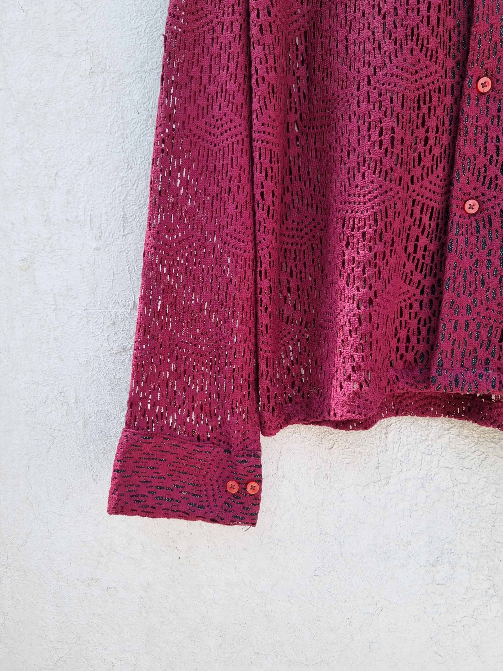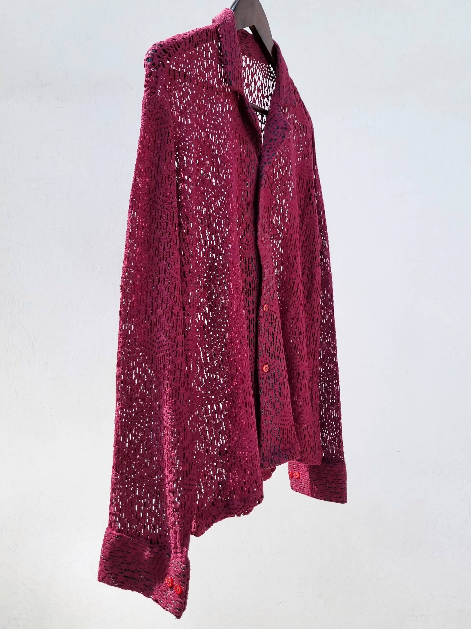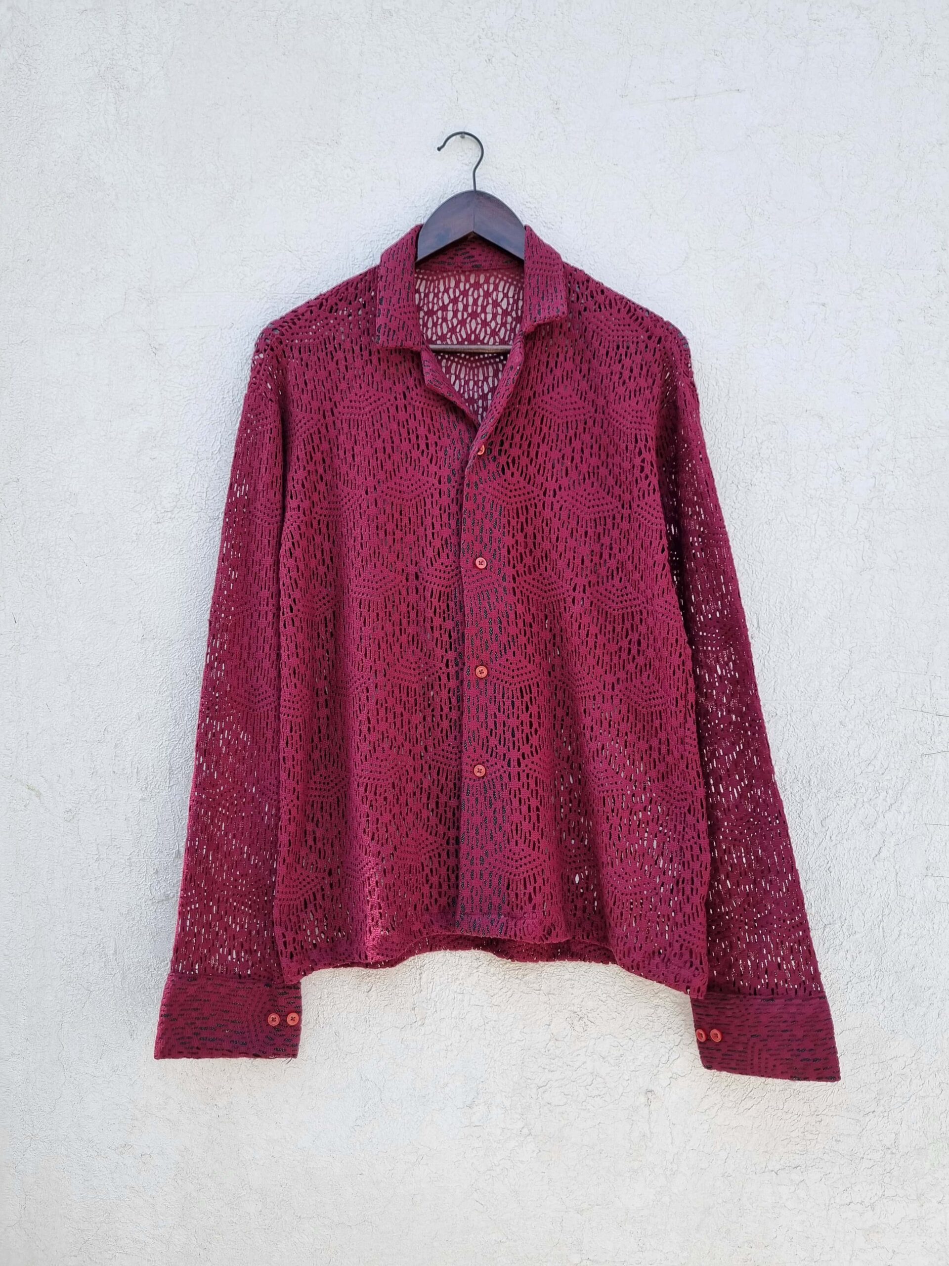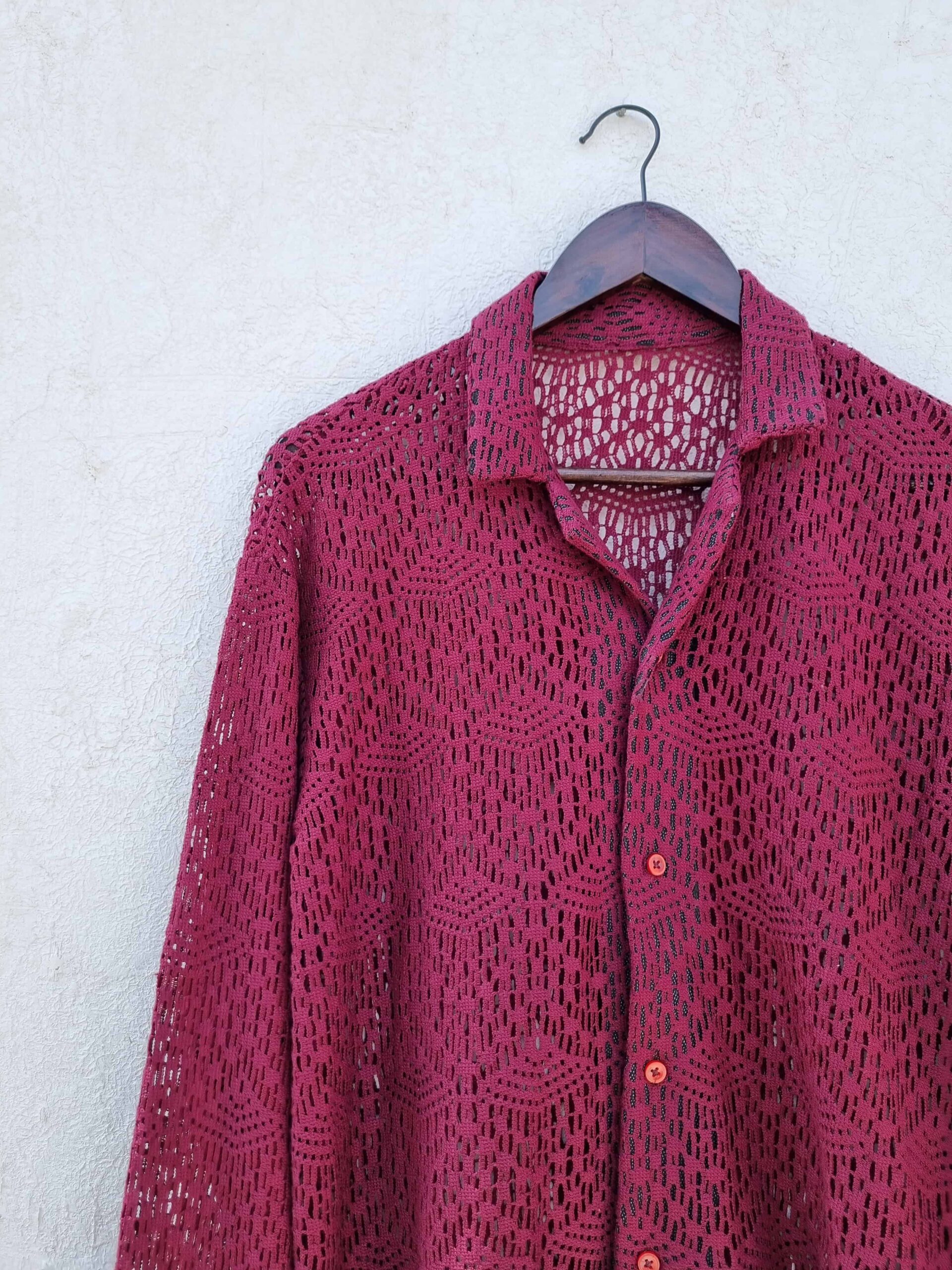 Elevate your wardrobe with this exquisite wine scalloped crochet shirt. Crafted with meticulous attention to detail, this versatile piece features intricate scallops and delicate, airy fabric, offering both style and comfort. Perfect for layering under a jacket or wearing solo for a breezy, bohemian vibe, it’s ideal for any season. The regular fit and timeless design make it a staple for casual outings or dressed-up occasions. Pair it with jeans for a chic daytime look or a trouser for an elegant evening ensemble. Add this elegant wine crochet shirt to your collection and enjoy its blend of sophistication and ease.