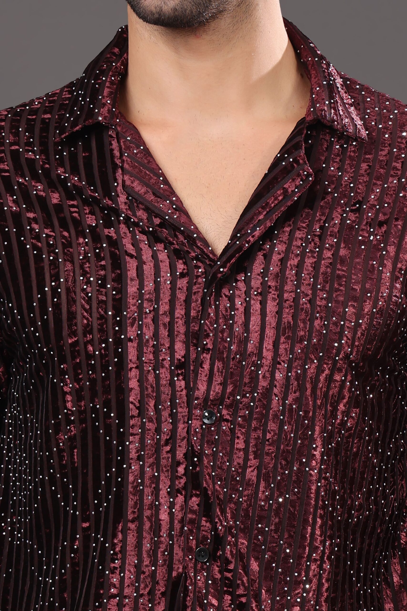 Turn heads with our Wine Velvet Striped Shirt, a masterpiece of elegance and modern design. Crafted from luxurious velvet in a deep wine hue, the shirt features tonal stripes that add depth and texture. Delicate rhinestone embellishments are artfully placed, lending a subtle sparkle and a touch of glamour. Designed with a classic collar and a tailored silhouette, this shirt seamlessly blends sophistication with a bold edge. Perfect for special occasions or stylish evening wear, pair it with sleek trousers or dark denim for an ensemble that radiates refined confidence and charm.