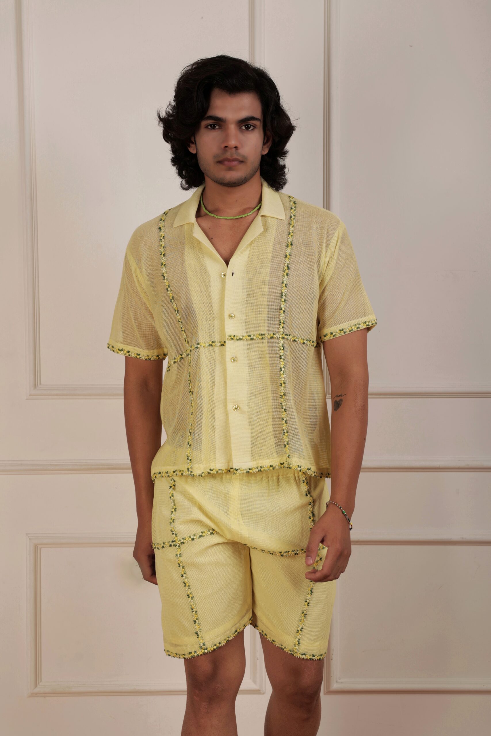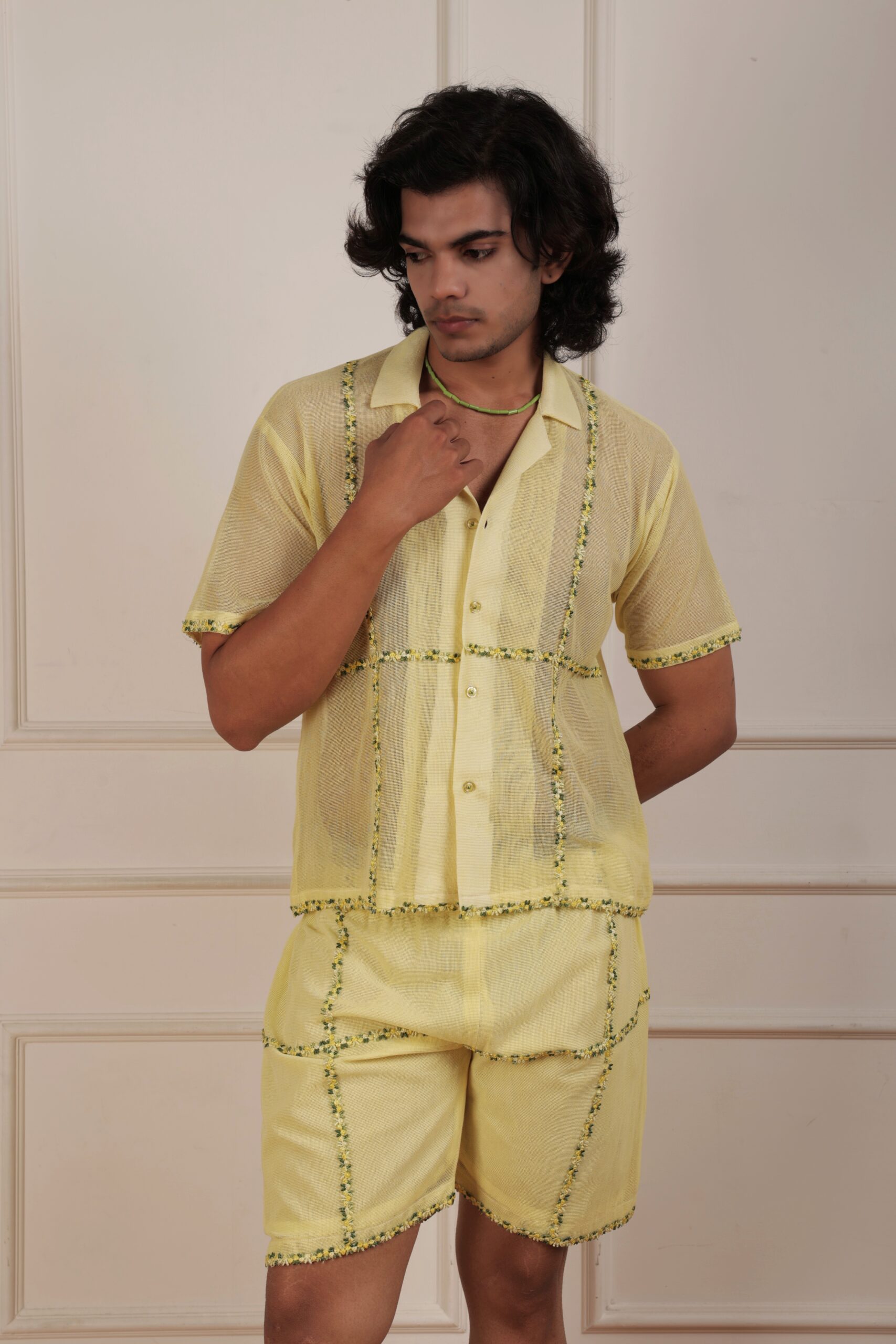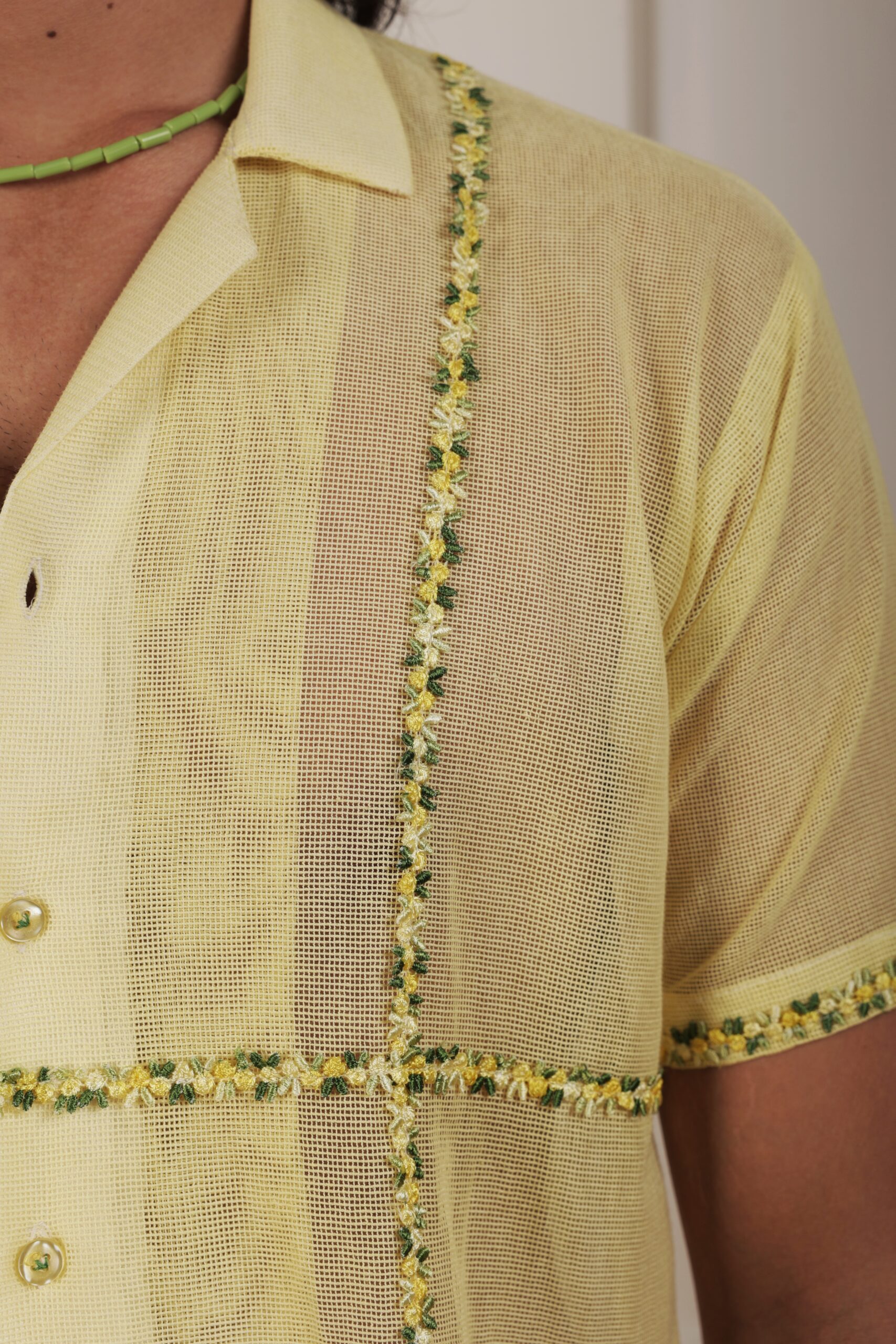Introducing our Yellow Cotton Mesh Shirt, a sun-kissed delight adorned with exquisite embroidered lace inspired by the enchanting beauty of post-monsoon florals. This shirt effortlessly merges comfort with sophistication, featuring breathable cotton mesh that drapes gracefully. The delicate floral lace embellishments evoke the essence of blooming flowers after the rain, infusing your style with a touch of natural allure. The radiant yellow hue adds a vibrant charm, making it a versatile piece for various occasions. Embrace the beauty of nature’s post-monsoon bloom with this enchanting shirt, designed to bring timeless elegance and a breath of fresh air to your wardrobe.