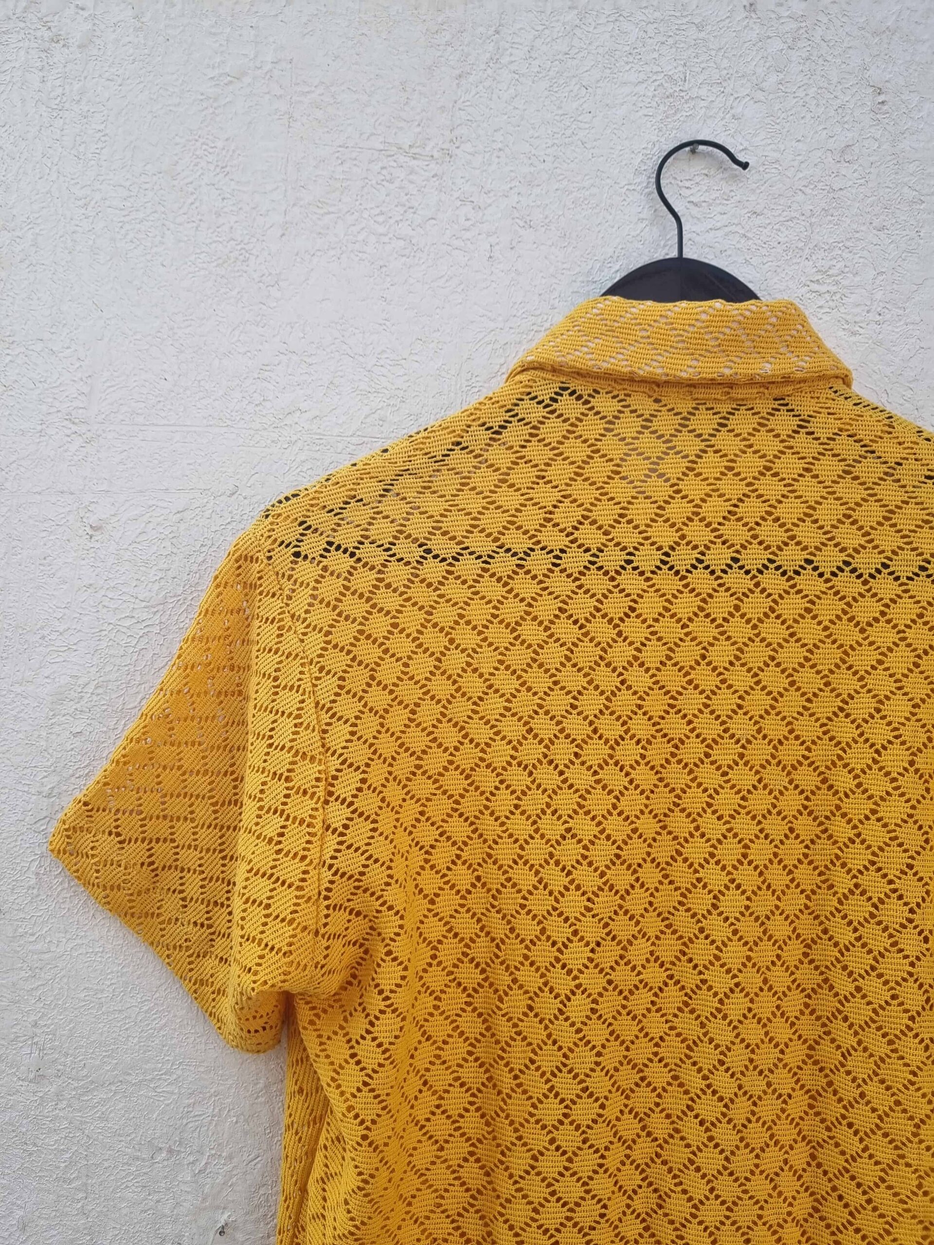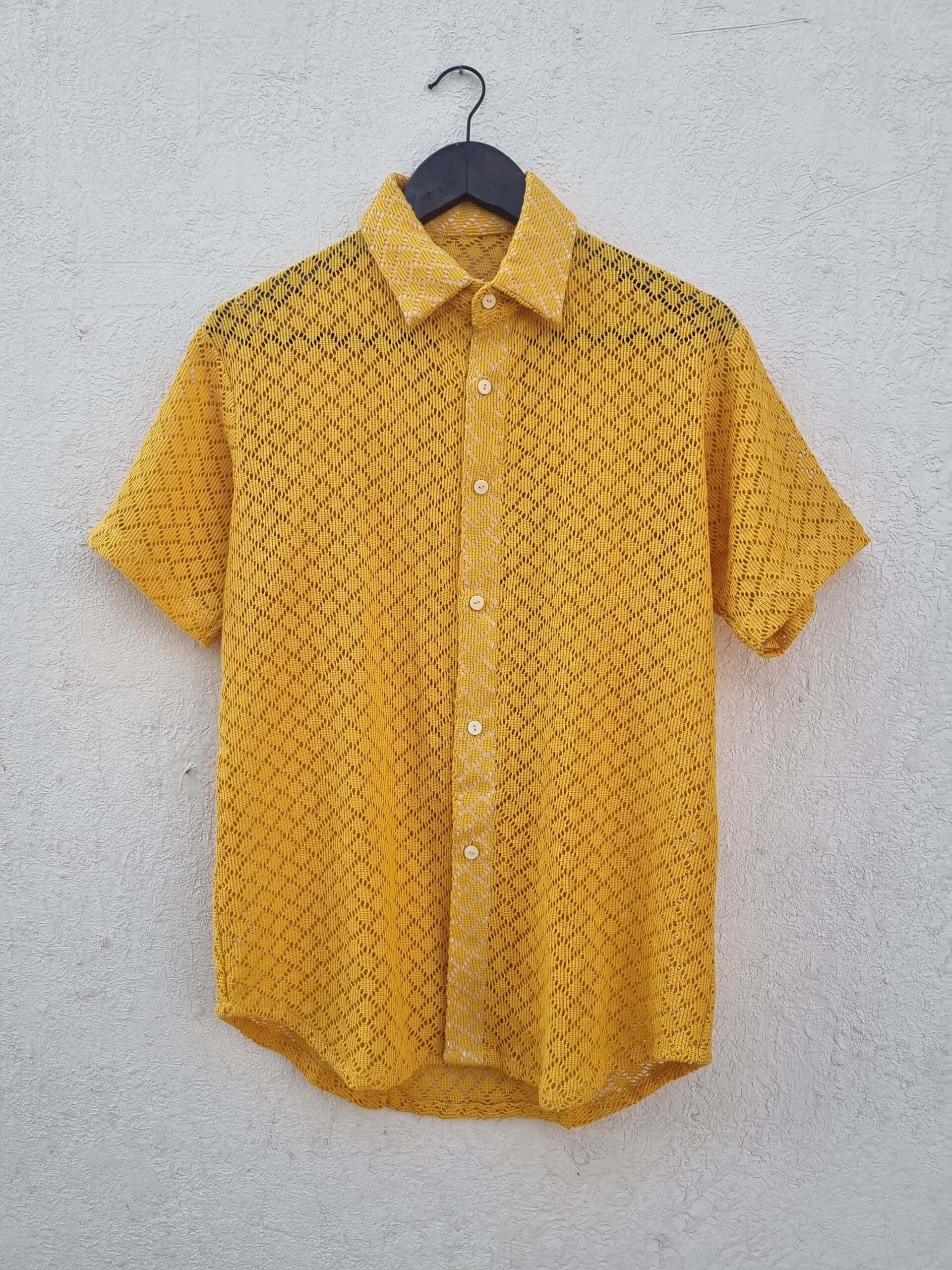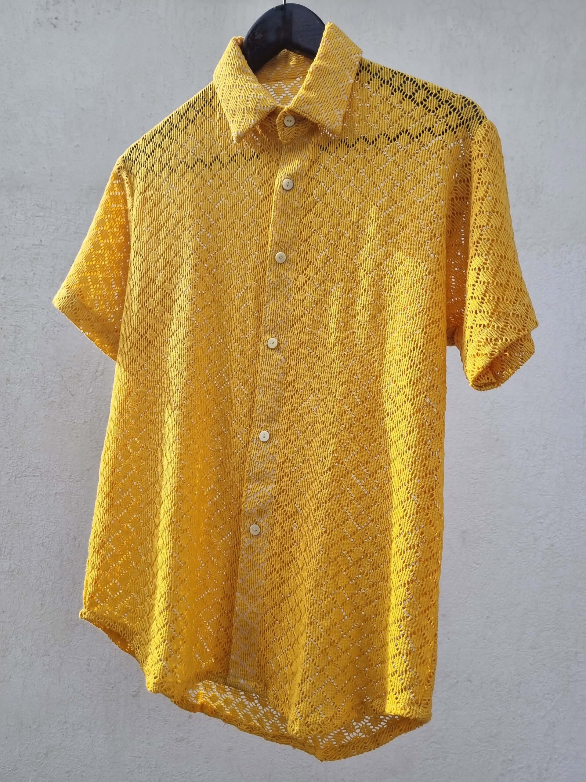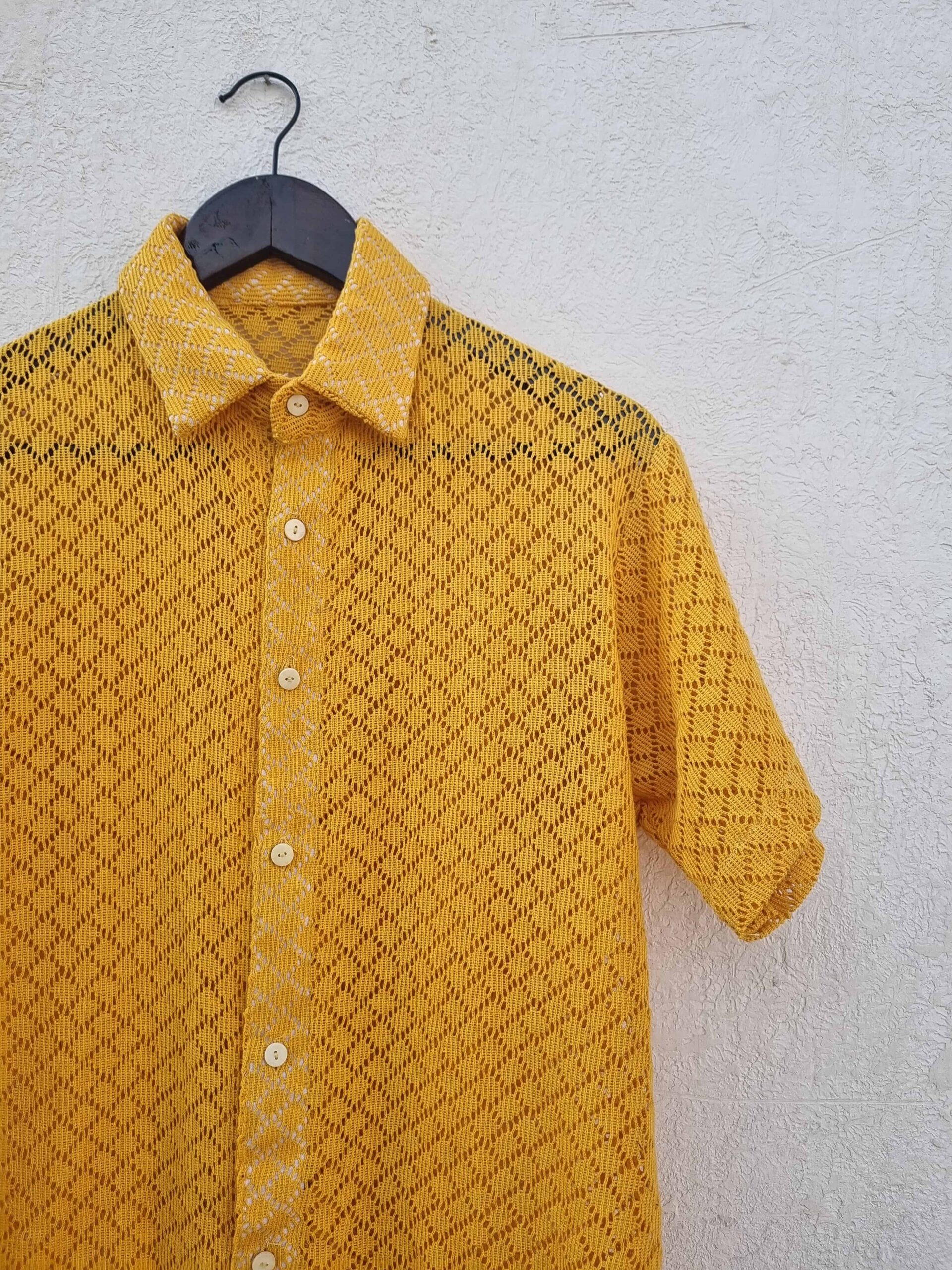 Elevate your wardrobe with this exquisite yellow crochet shirt. Crafted with meticulous attention to detail, this versatile piece features intricate geometrical and delicate, airy fabric, offering both style and comfort. Perfect for layering under a jacket or wearing solo for a breezy, bohemian vibe, it’s ideal for any season. The regular fit and timeless design make it a staple for casual outings or dressed-up occasions. Pair it with jeans for a chic daytime look or a trouser for an elegant evening ensemble. Add this elegant yellow crochet shirt to your collection and enjoy its blend of sophistication and ease.